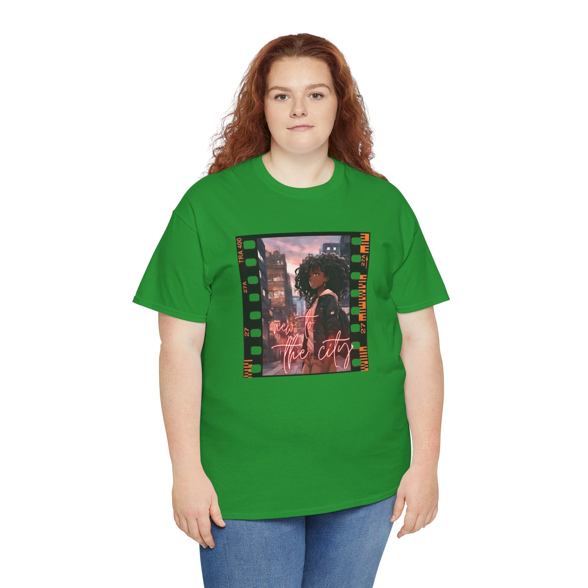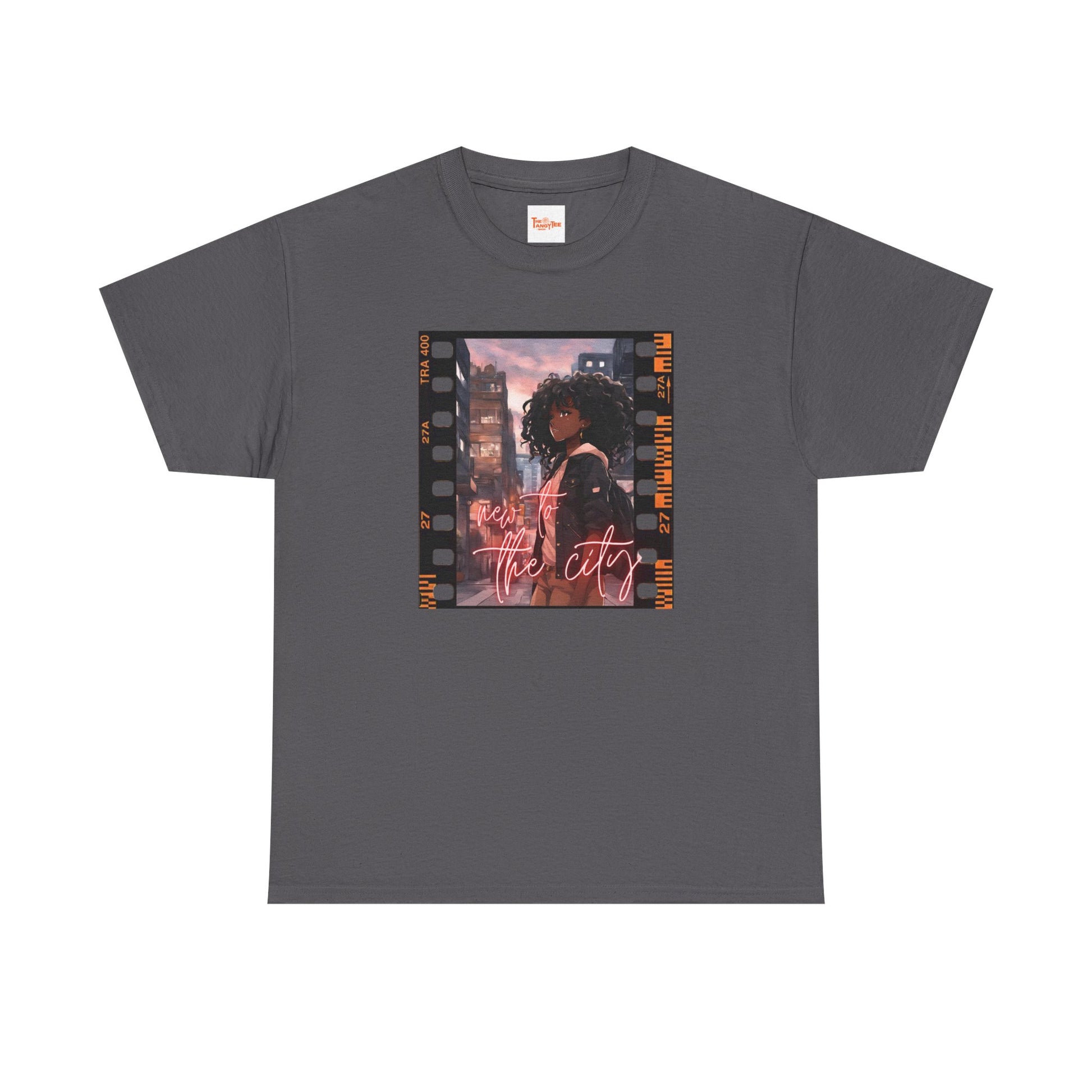 A unisex heavy cotton tee featuring a graphic of a cute black anime girl in the city, giving off a trendy urban vibe. Perfect for city dwellers, anime fans, and anyone looking for a unique and stylish piece to add to their wardrobe. Ideal for casual wear, city outings, and anime conventions.