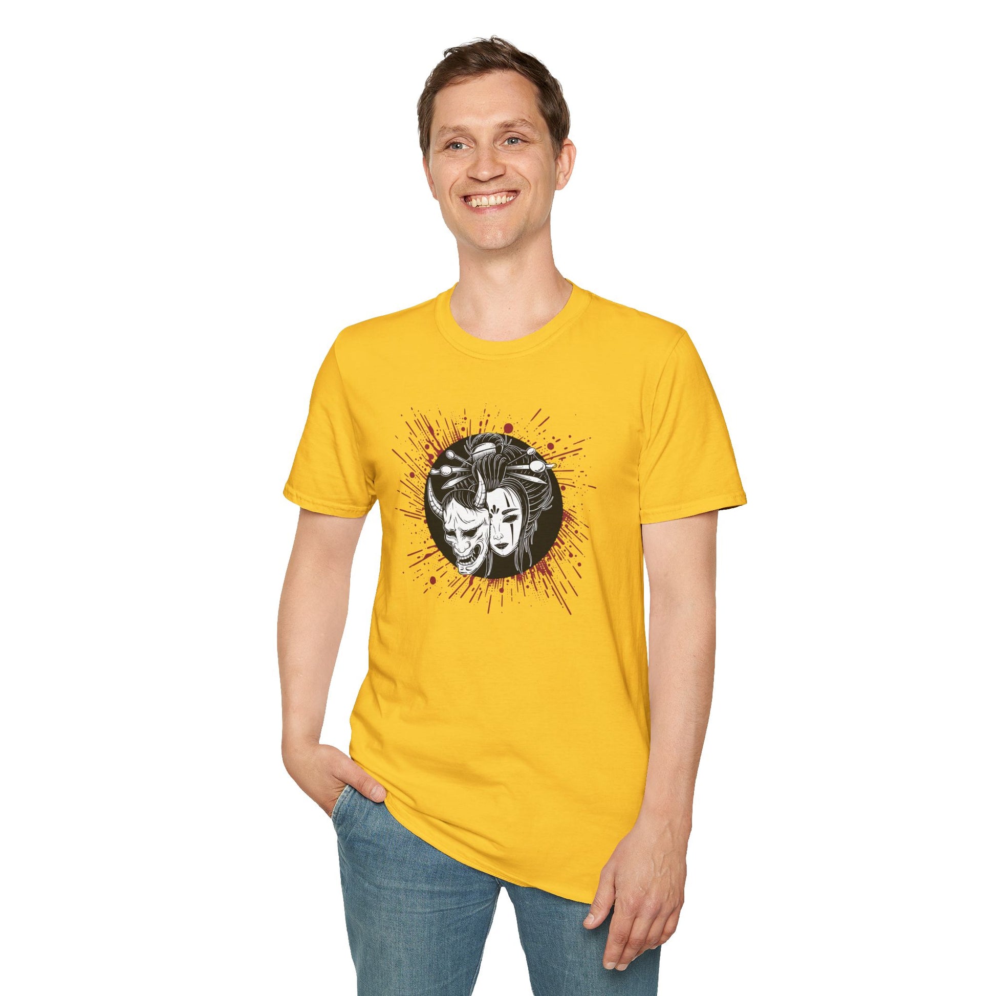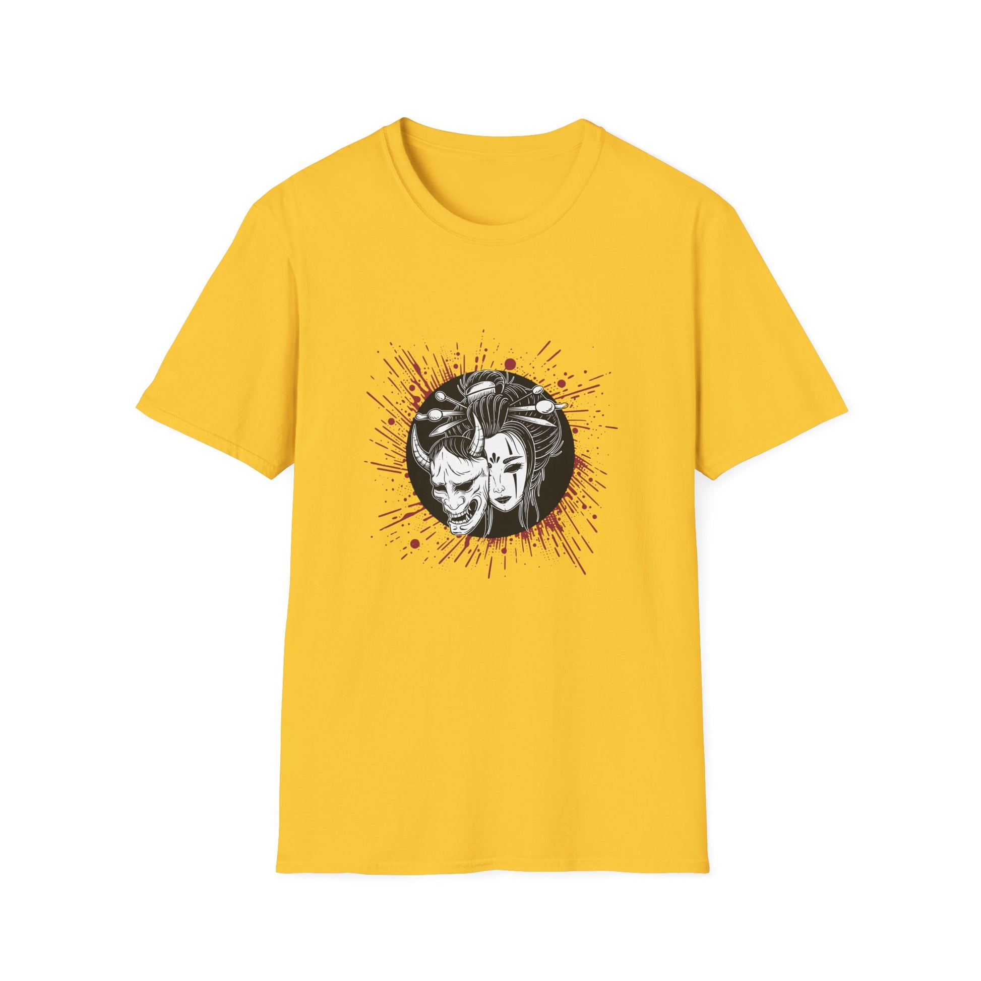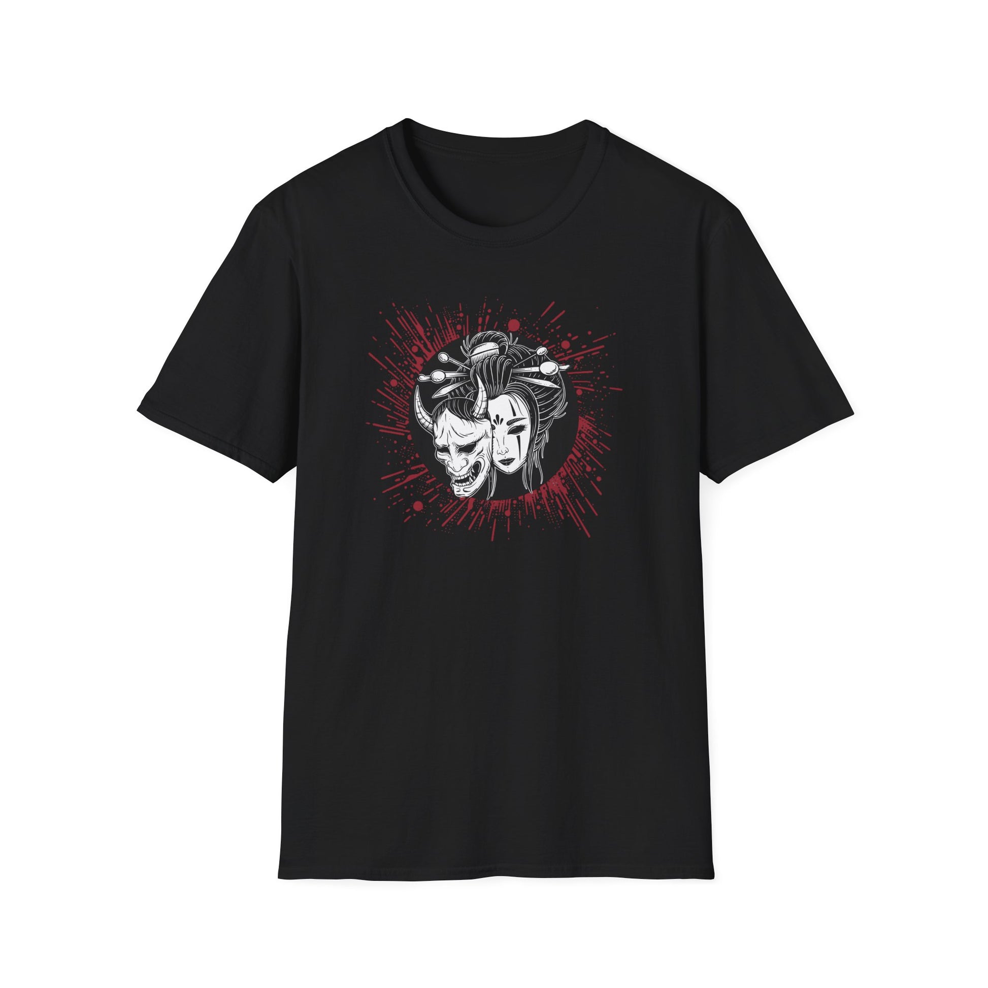 A bold and unique graphic of an Asian mask against a red backsplash on this unisex softstyle T-shirt creates an edgy and artistic vibe. Perfect for those who appreciate cultural artwork and enjoy making a statement with their clothing. Ideal for casual wear, art enthusiasts, and those looking to stand out during cultural events or art festivals.