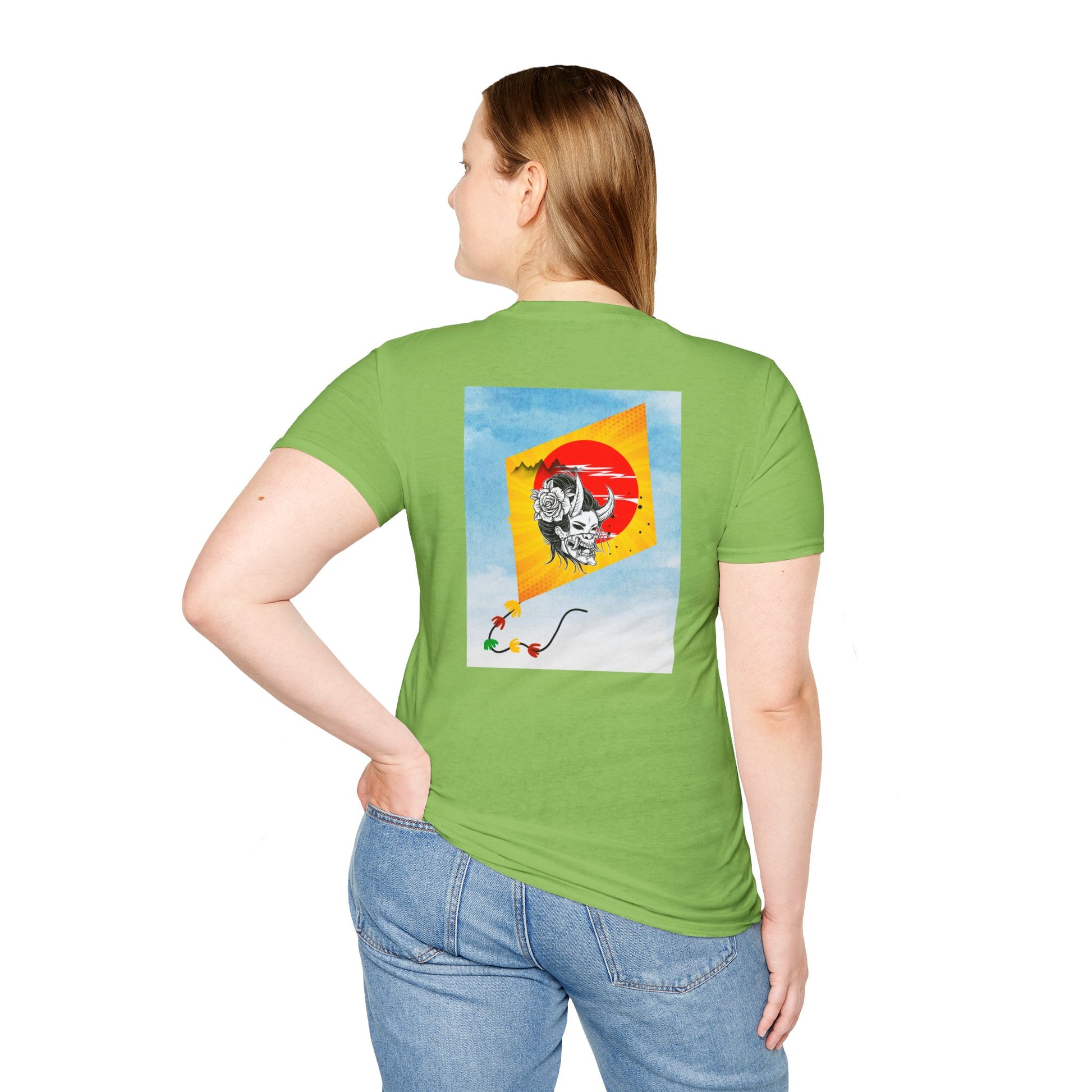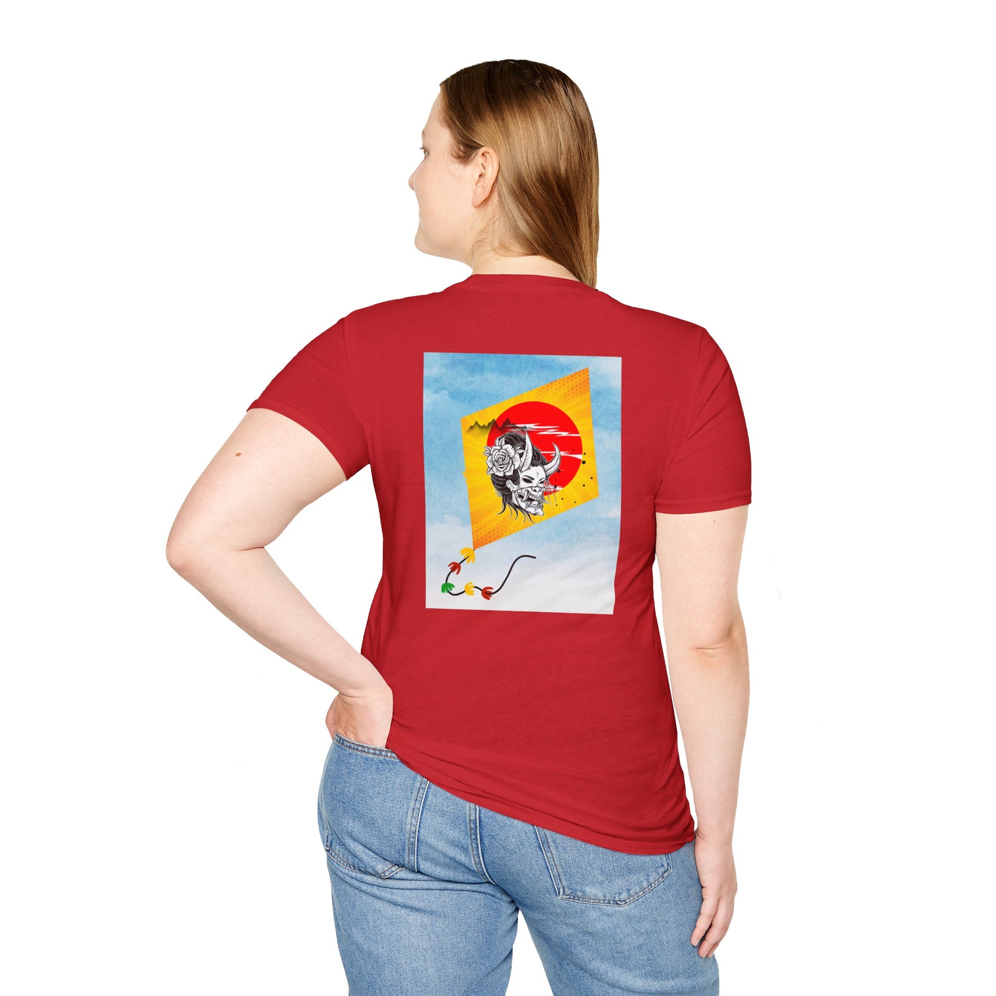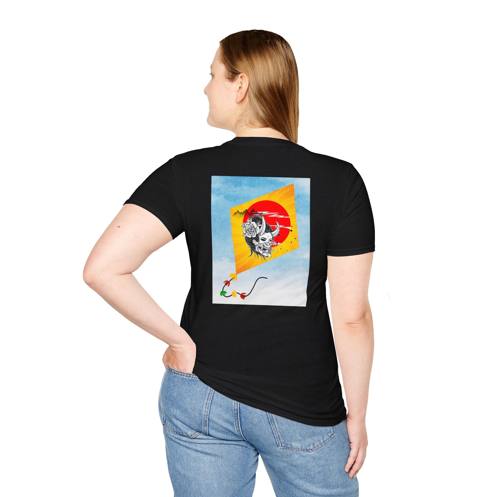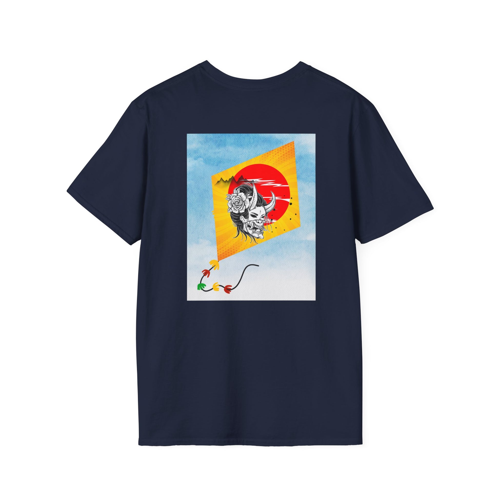 A unique T-shirt featuring a graphic of an Asian mask on a kite. This T-shirt is made with 100% ring-spun cotton, ensuring a lightweight and comfortable feel. The classic fit and crew neckline make it versatile for any occasion, be it formal or casual. Ideal for adults looking to add a touch of artistic flair to their wardrobe, especially during cultural celebrations or art-themed events.