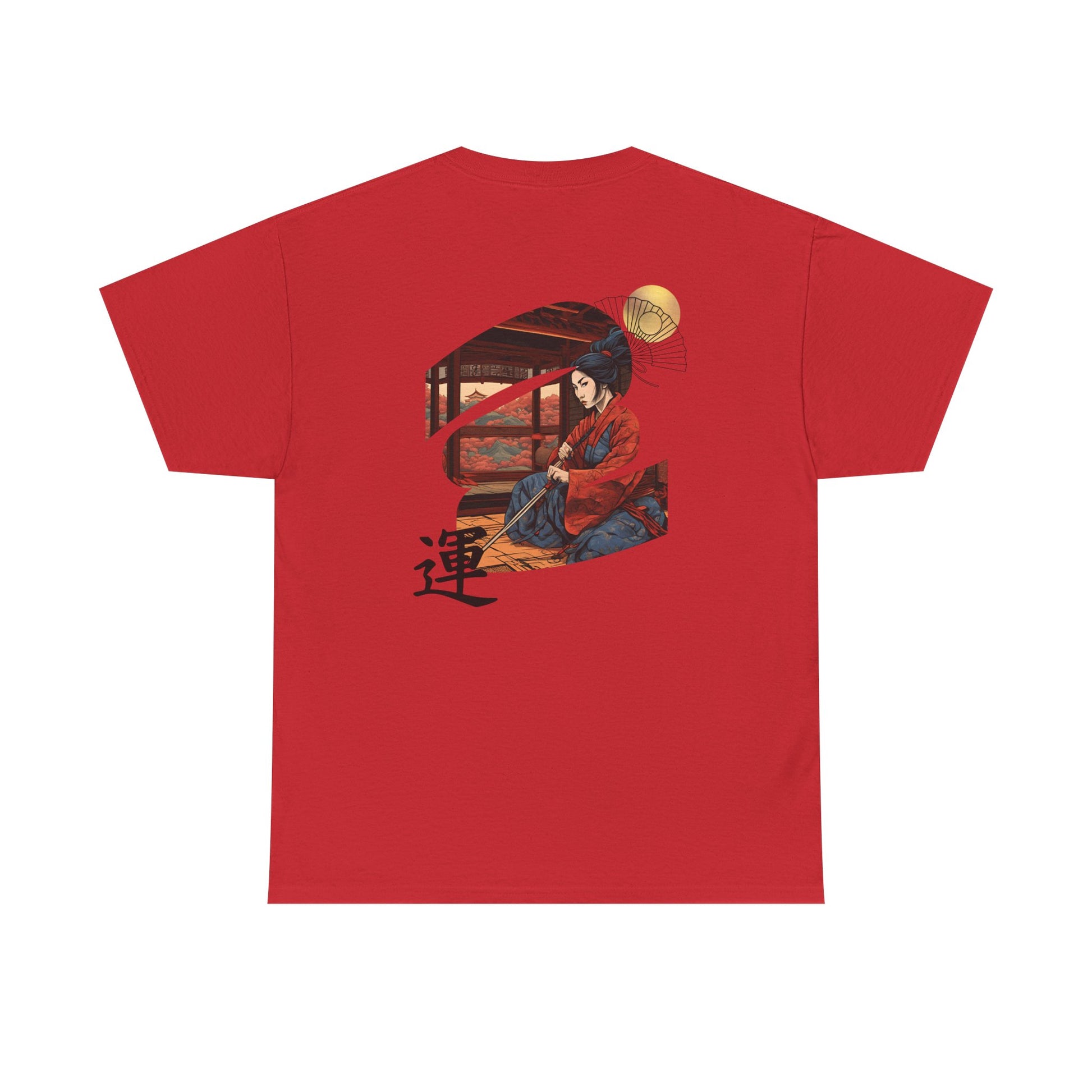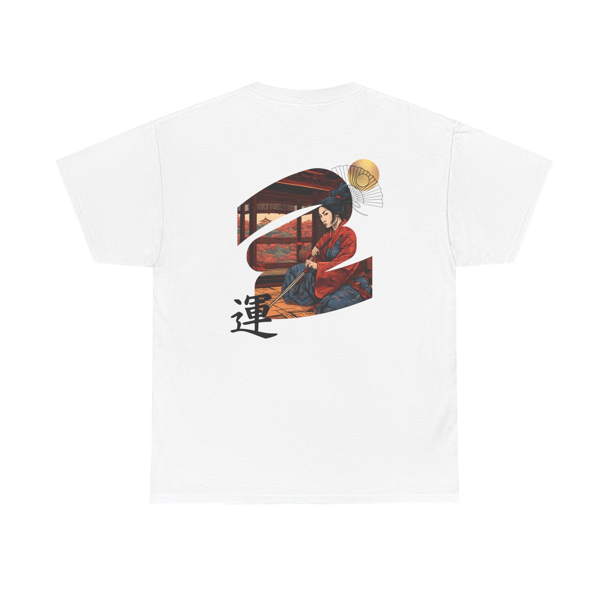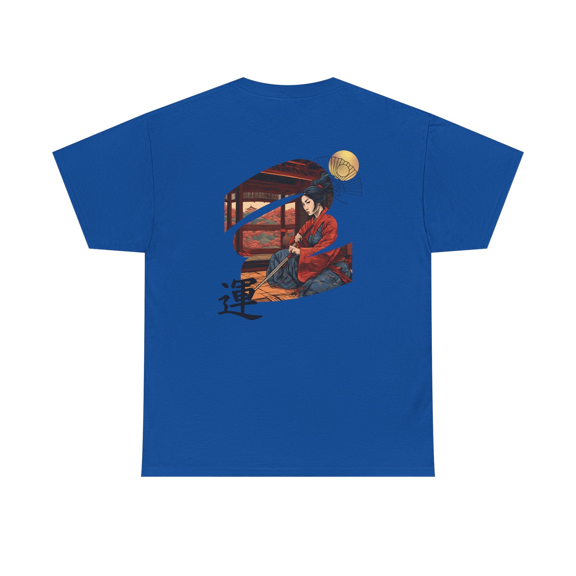 This tee carries quiet strength. The graphic — an Asian woman poised with a sword and a subtle good-luck symbol — feels like a private amulet: calm, focused, and ready. Wear it when you want to move through the day with intention. The medium-weight cotton sits close enough to layer, yet breezy enough for solo wear. The print’s fine detail holds up over washes, so the image remains sharp while the shirt softens and conforms to your rhythm. It suits someone who appreciates understated power, cultural motifs rendered with respect, and clothing that steps into everyday moments without shouting. Bring it to market nights, dojo drop-ins, or long city walks — it will age into something familiar and steady on your shoulder.