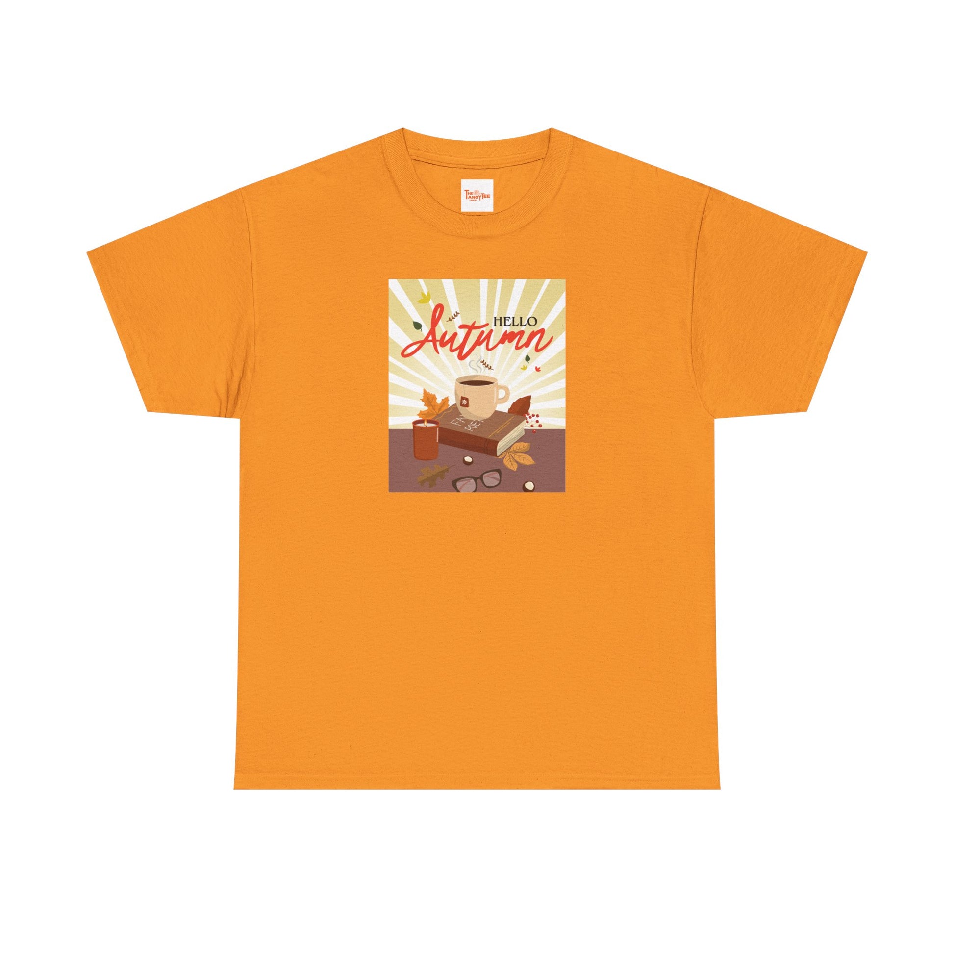 A cozy and versatile T-Shirt featuring a graphic of a cup of coffee beside a book, perfect for welcoming the autumn season. This unisex heavy cotton tee is great for adults looking for a comfortable and stylish wardrobe addition. Ideal for casual wear, fall festivities, and cozy days spent reading indoors.