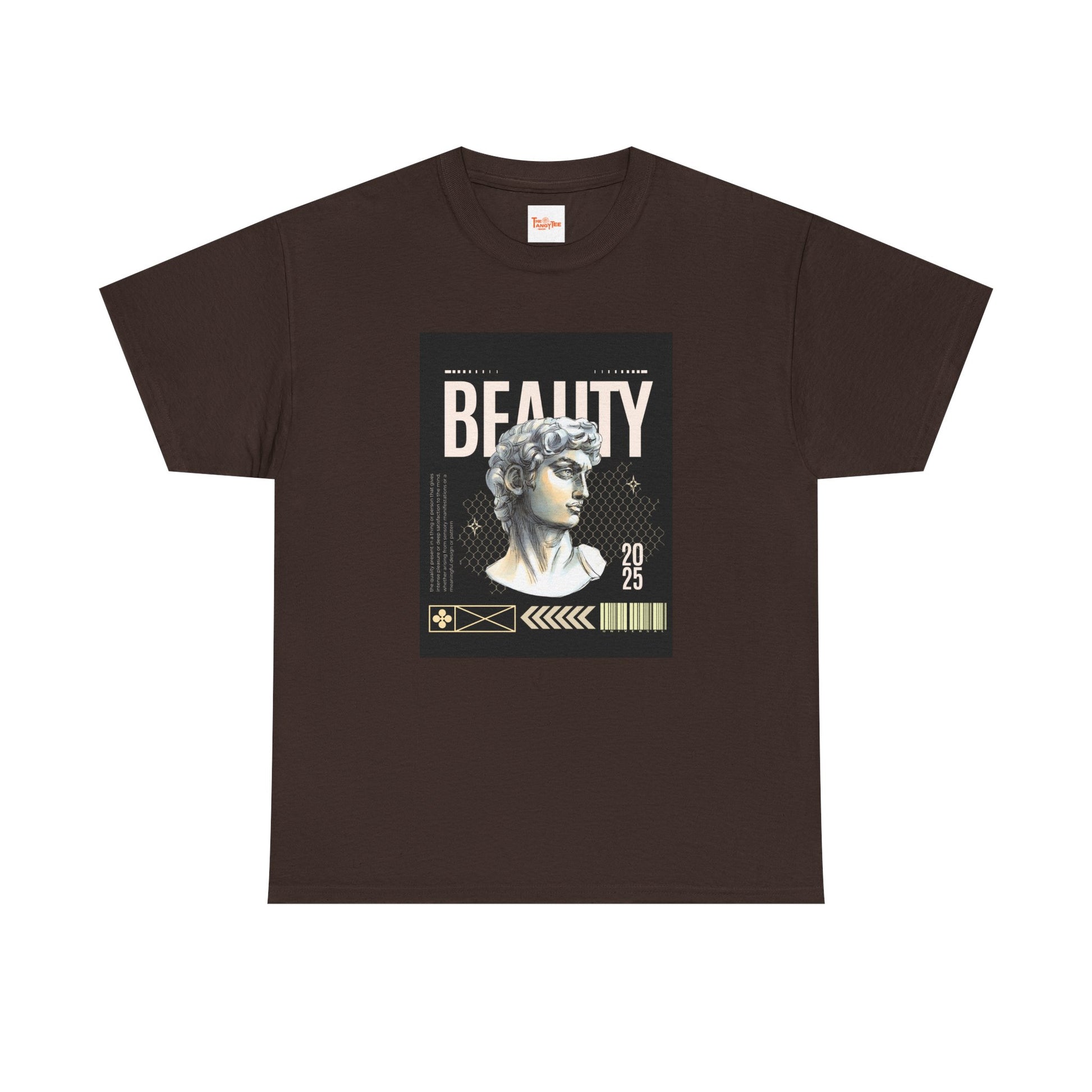 A classic unisex tee featuring a graphic of the David sculpture's head beside a definition of beauty. The shirt is made with specially spun fibers for a strong and smooth fabric, perfect for printing. This tee is ideal for adults looking for a unique and artsy addition to their wardrobe. Perfect for art enthusiasts and individuals celebrating beauty and artistry.