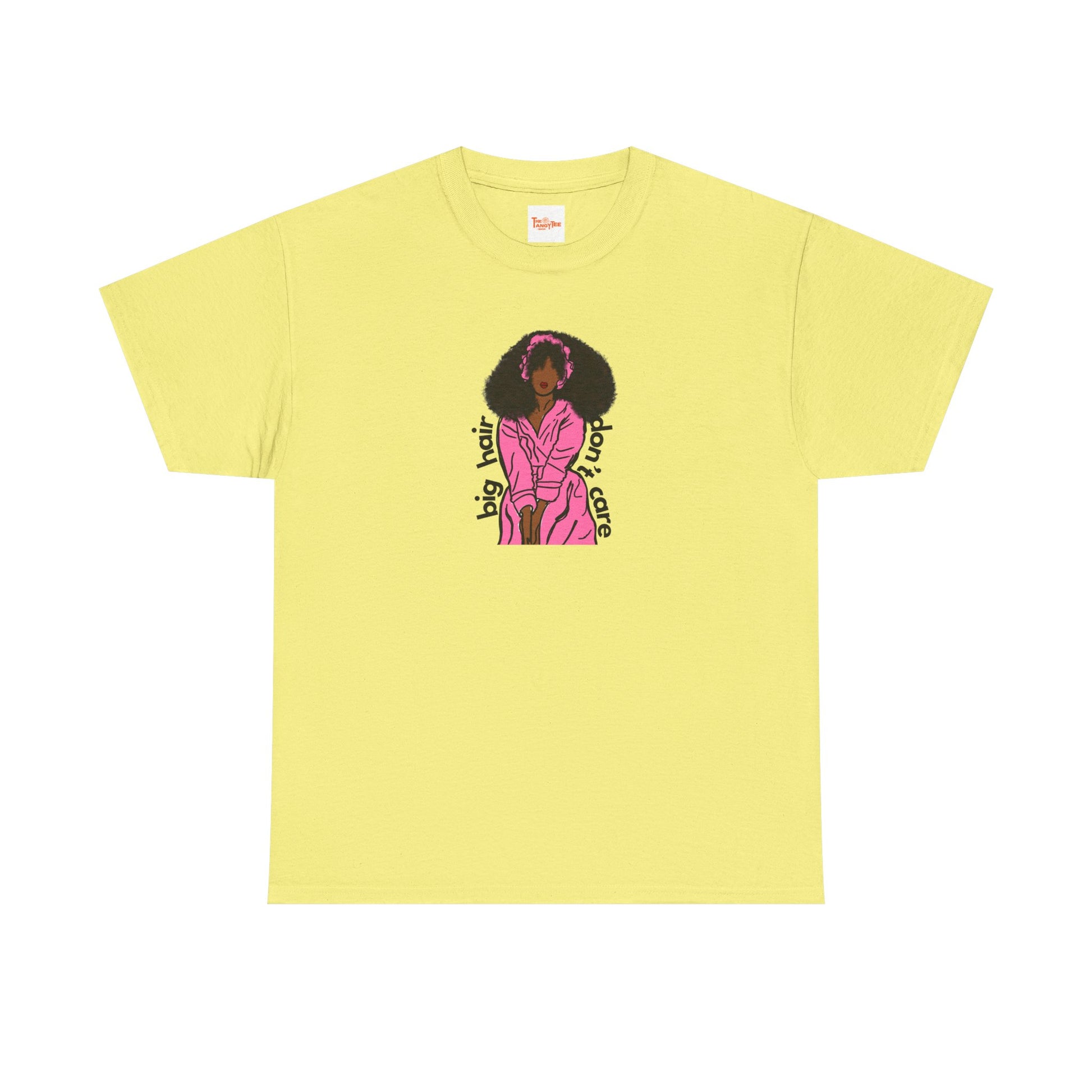 A comfortable and versatile T-Shirt featuring a graphic of a black woman with a big afro and the phrase 'Big Hair, Don't Care.' This tee exudes a confident and carefree vibe, perfect for those who embrace their natural hair and want to make a statement. Ideal for individuals looking for a unique, empowering piece to add to their wardrobe. Relevant for Black History Month, International Women's Day, and everyday wear.