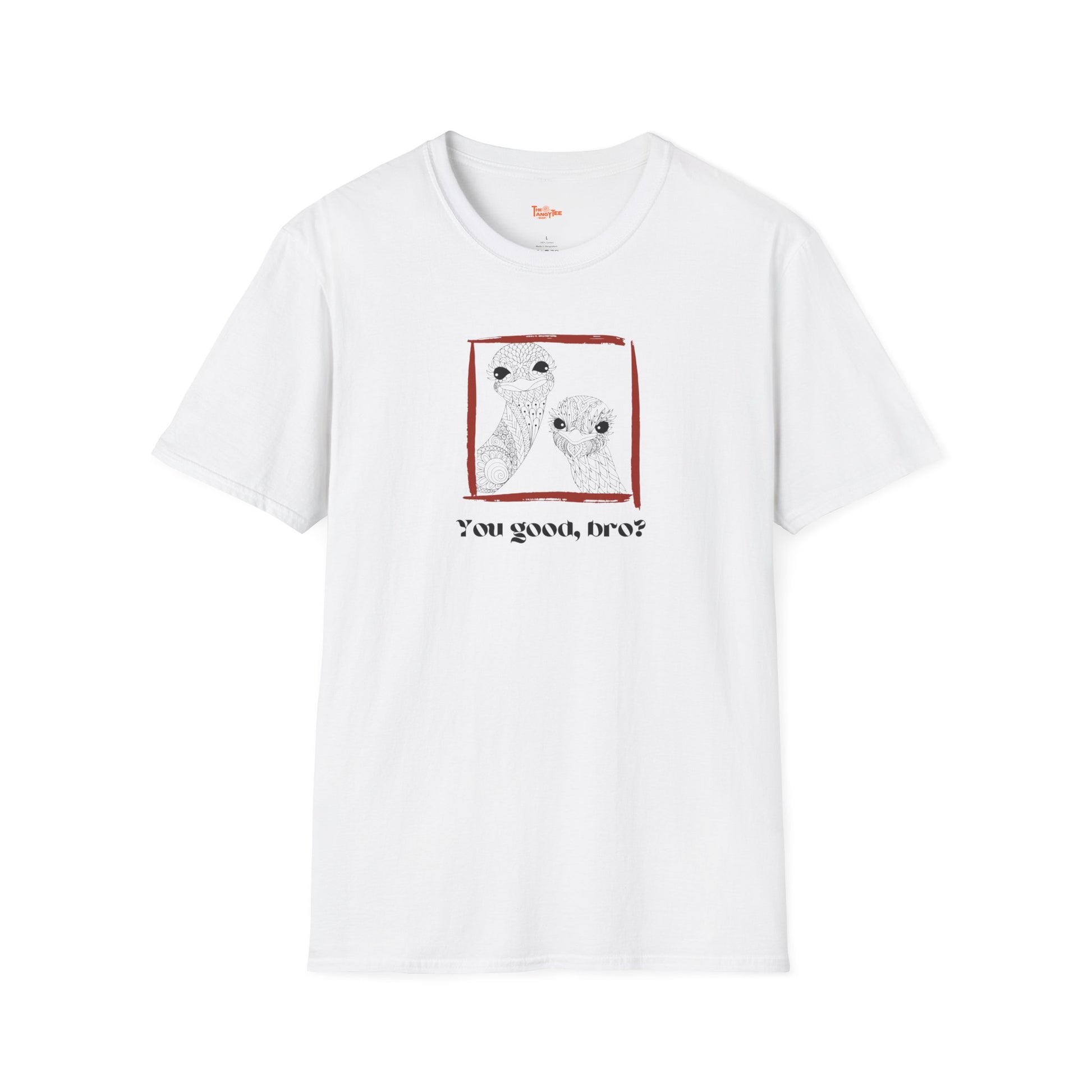 A comfortable and stylish graphic T-Shirt featuring a design of two birds with the phrase 'You good, bro?'. This T-Shirt gives off a casual and friendly vibe, perfect for everyday wear or as a thoughtful gift. Relevant to adults, this T-Shirt is suitable for any casual occasion or for lounging around. Ideal for birthdays, casual hangouts, or just to add a fun touch to your outfit.