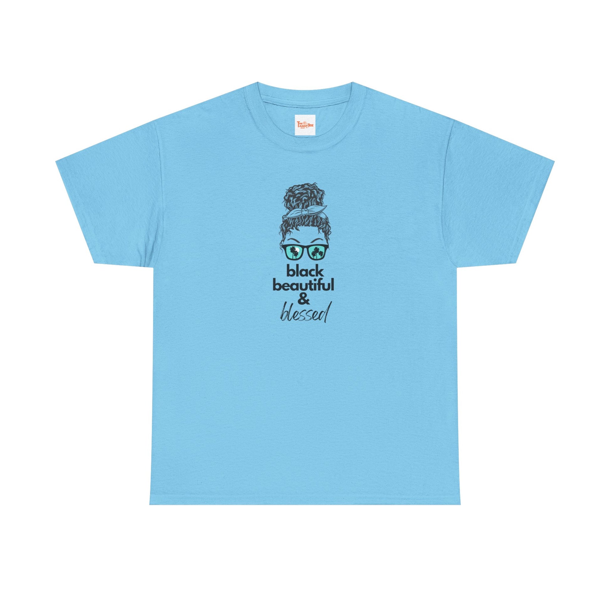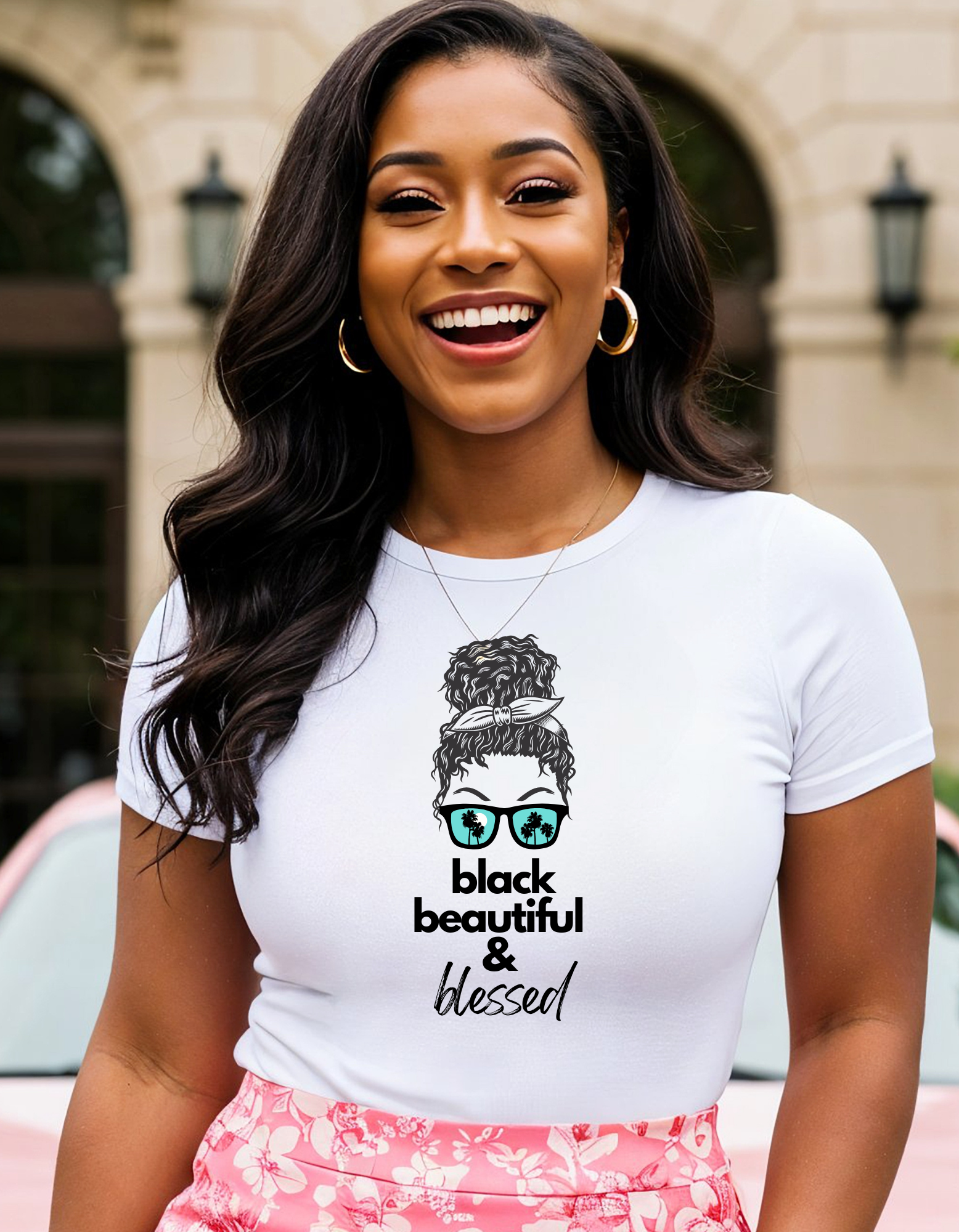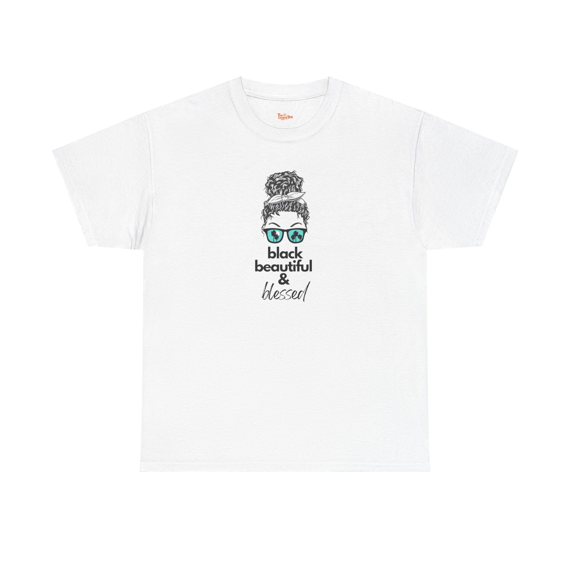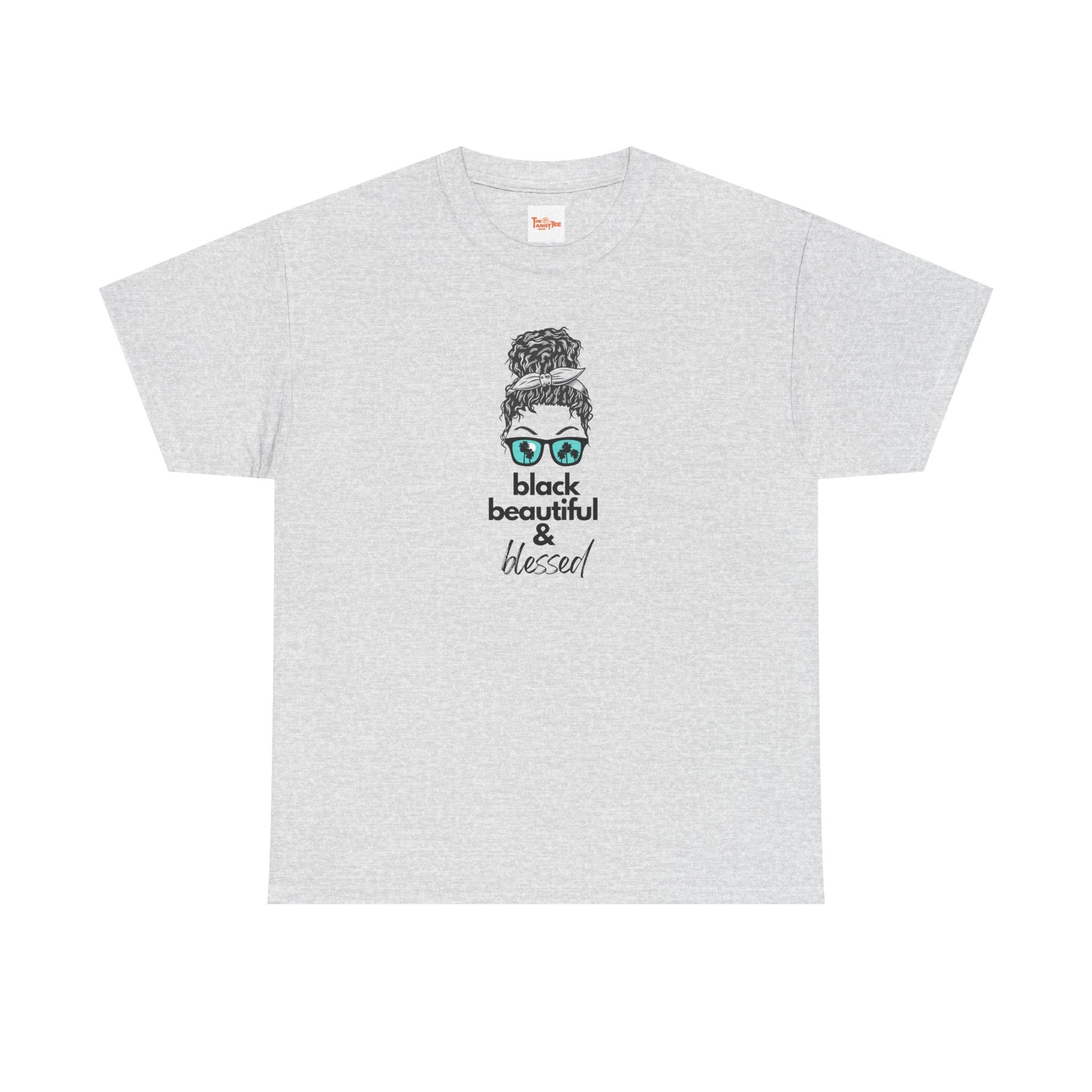 A Black, Beautiful, and Blessed graphic tee featuring a woman's face wearing sunglasses. This tee exudes confidence and style, perfect for those who want to showcase their empowerment and positivity. Ideal for those who love unique graphic tees and want to make a bold fashion statement. Great for wearing on casual outings, social gatherings, or as a comfortable everyday staple. Perfect for celebrating Black History Month, Women's History Month, or any occasion where empowerment is celebrated.