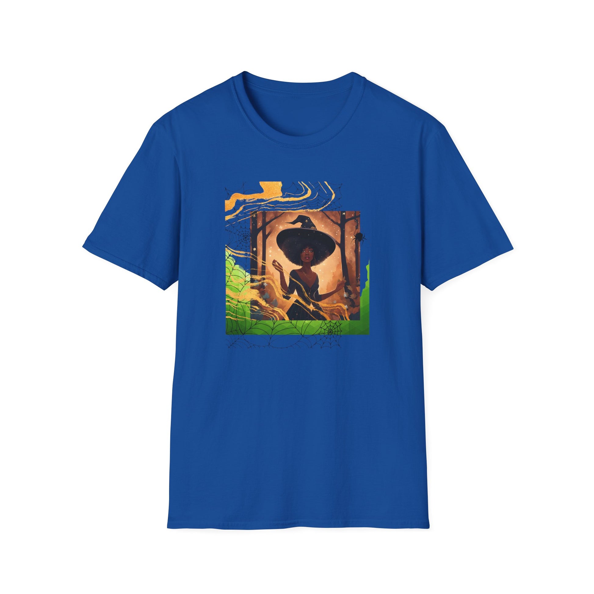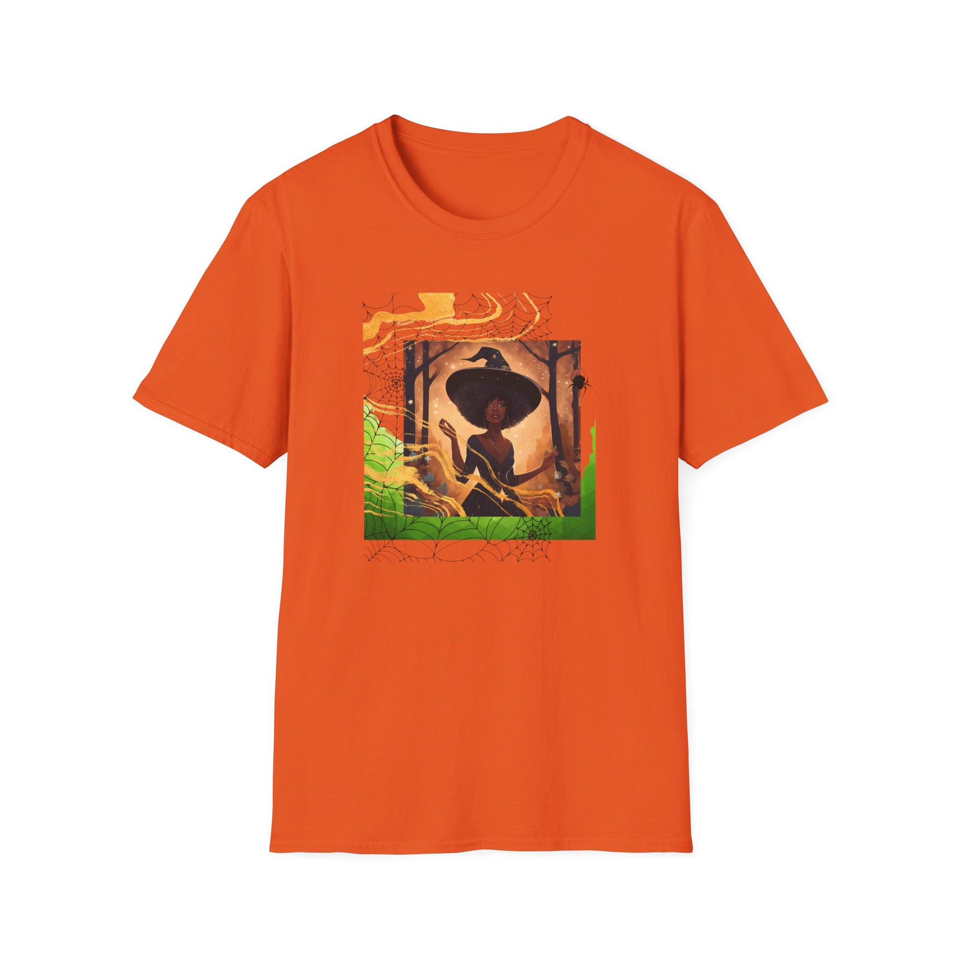A black witch with a spider web graphic T-Shirt, perfect for Halloween enthusiasts and gothic fashion lovers. This unisex softstyle T-Shirt is made from durable and smooth fabric, providing comfort all year round. It features a classic fit with a crew neckline, suitable for any occasion, whether formal or semi-formal.