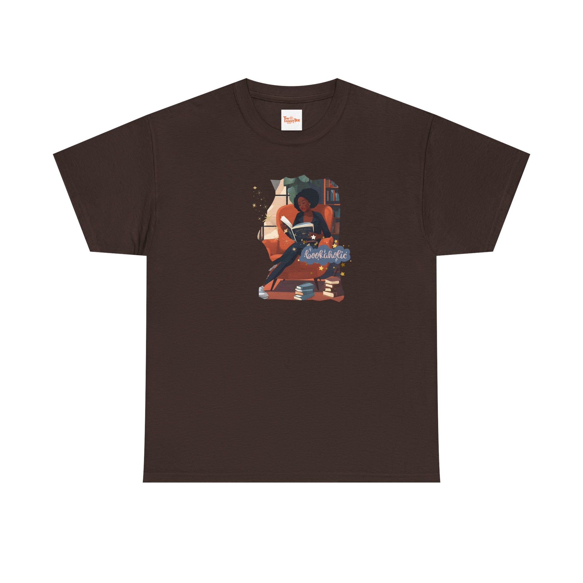 Bookaholic, graphic of a Black woman relaxing in her home surrounded by books and a cat. This T-Shirt exudes a cozy and bookish vibe, perfect for book lovers looking for a comfortable and stylish wardrobe addition. Ideal for casual wear or lounging around the house, this tee is a great gift for bookworms and cat lovers alike, suitable for holidays like Christmas or birthdays.