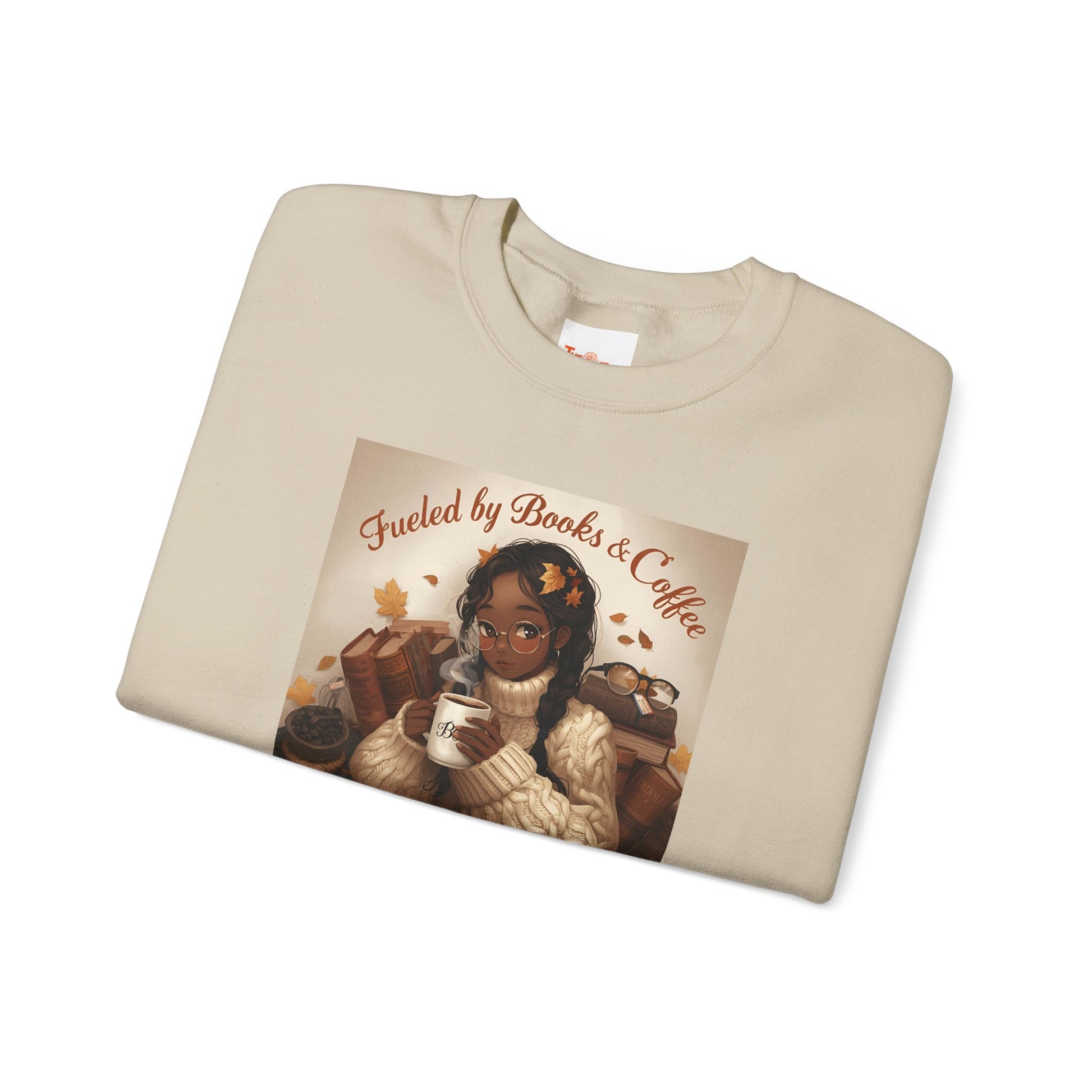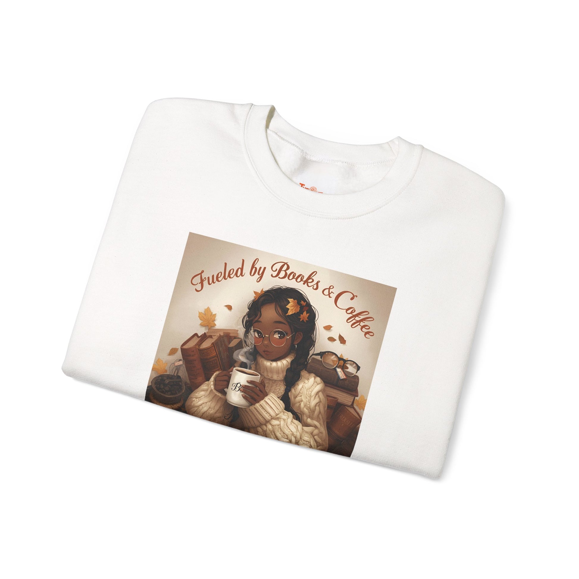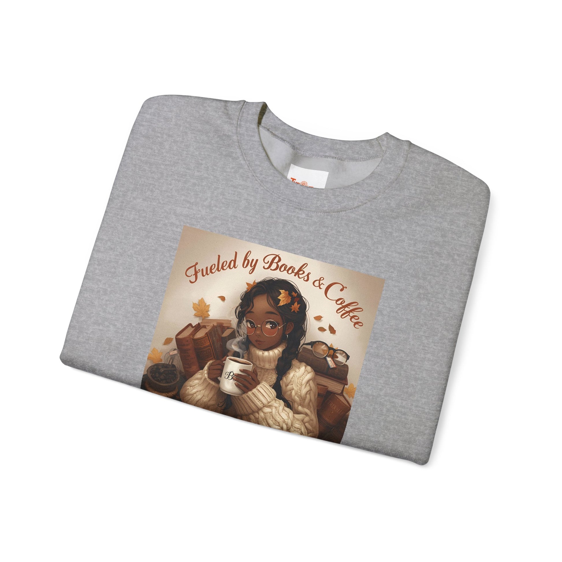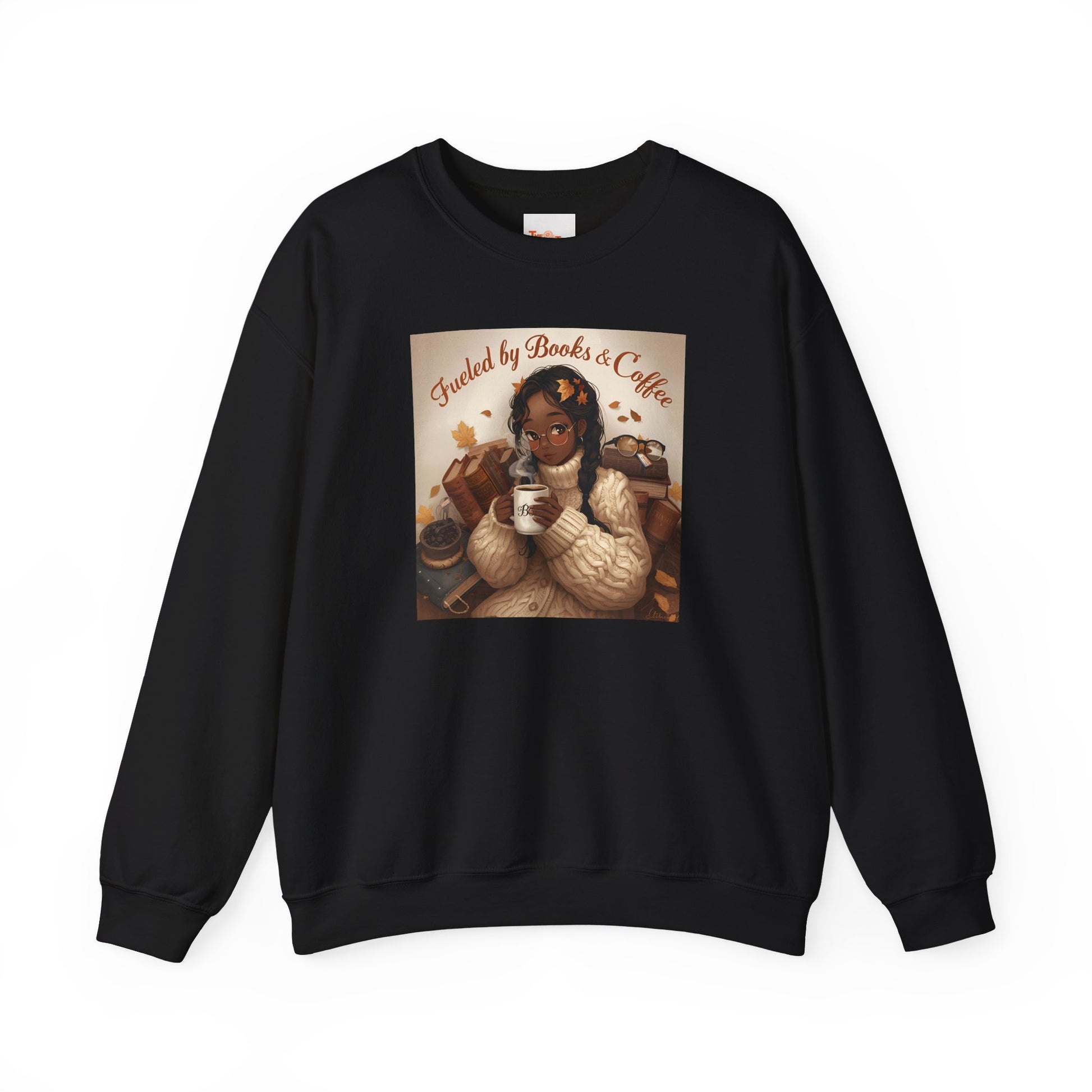Stay cozy and stylish with this Unisex Heavy Blend™ Crewneck Sweatshirt featuring a Black anime woman surrounded by books and fall leaves, with the message 'Fueled by Books and Coffee'. Perfect for book lovers and coffee enthusiasts, this sweatshirt is ideal for the fall season and can be worn for casual outings or cozy nights in.