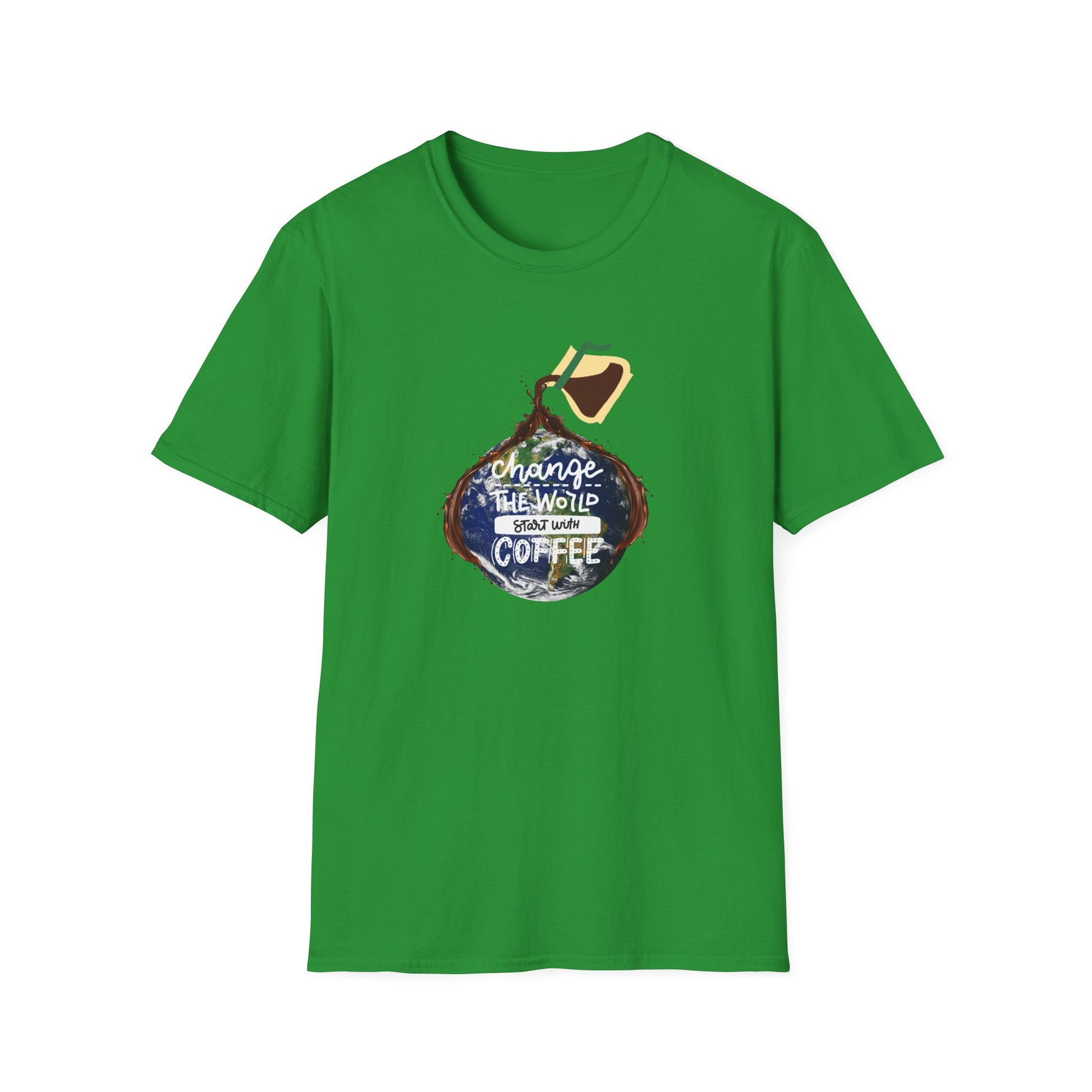 This T-Shirt features a graphic of coffee being poured on an image of Earth with the message 'Change the World, Start with Coffee'. It gives off a laid-back and casual vibe, perfect for coffee lovers and environmental enthusiasts. It is relevant for Earth Day, International Coffee Day, and casual everyday wear.
