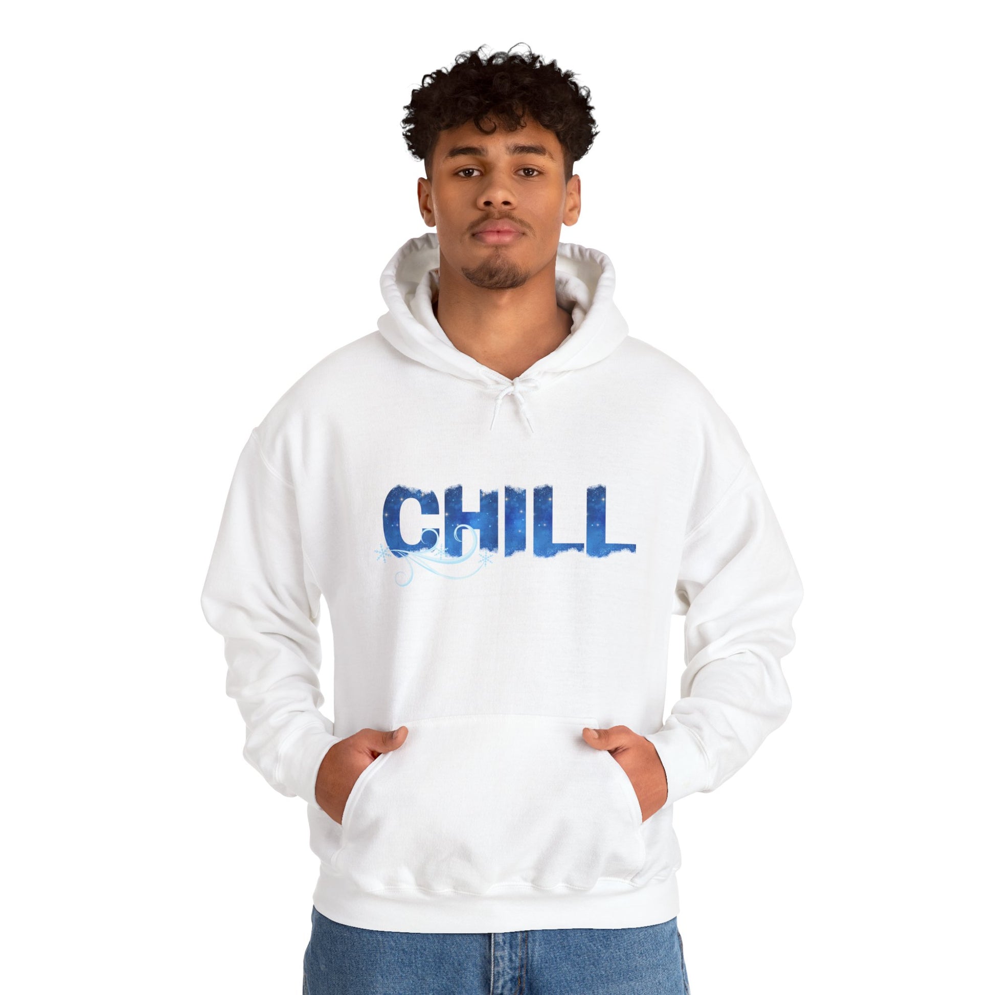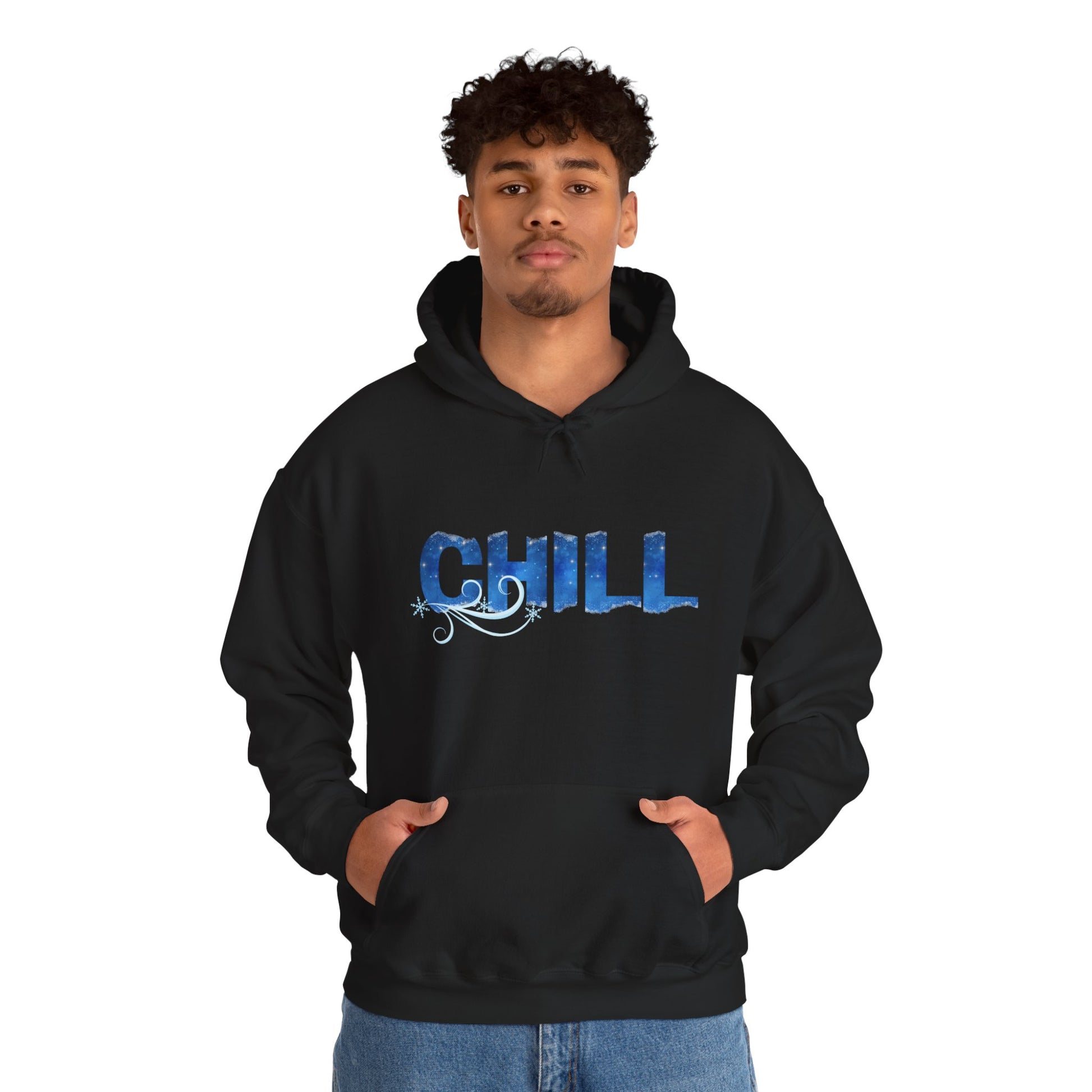 Chill, graphic of snowy letters hoodie perfect for cozy days and winter vibes. Ideal for adults looking for a stylish and comfortable piece to stay warm. Relevant for winter holidays, weekends, and casual outings.