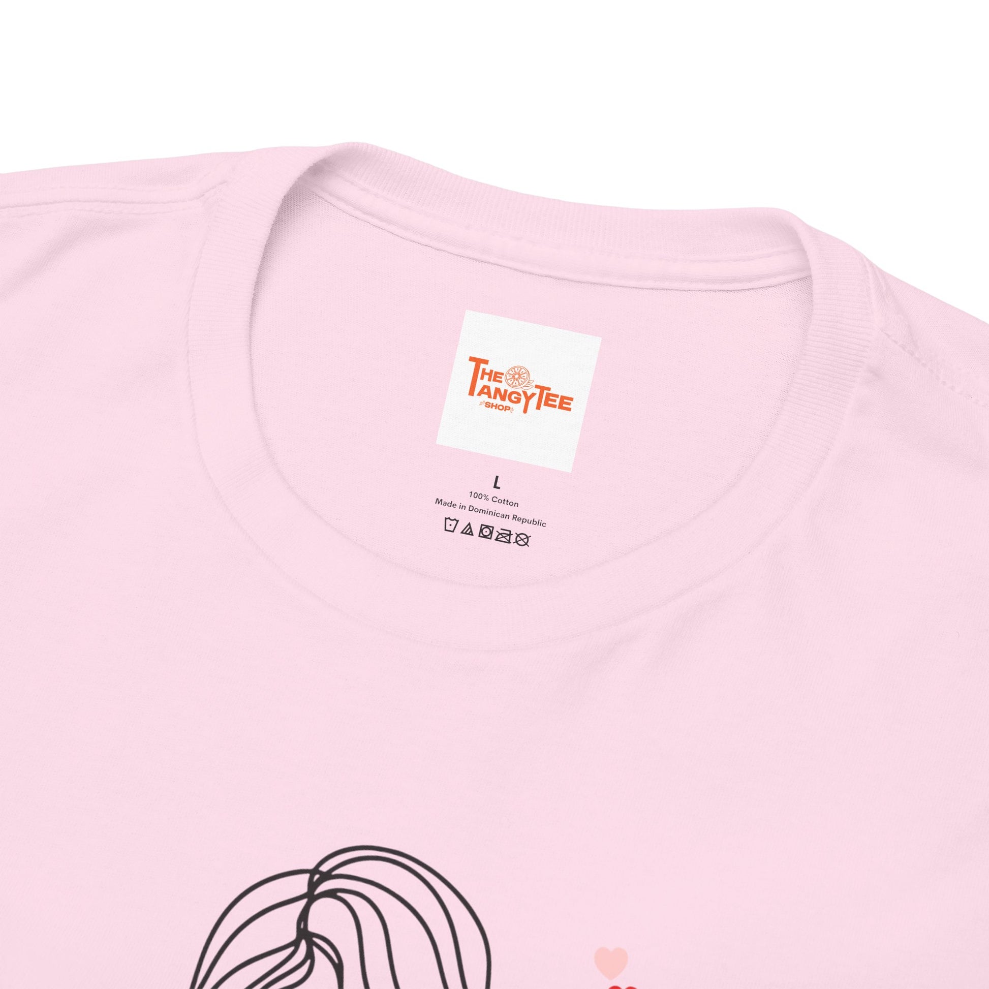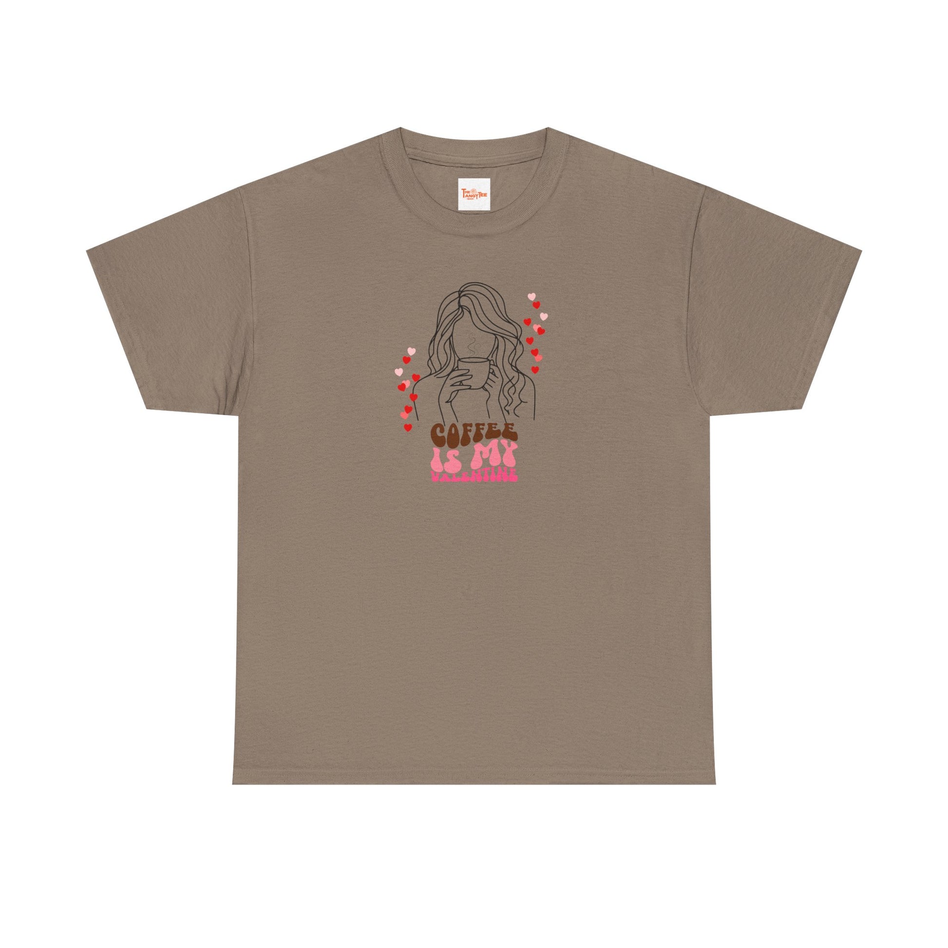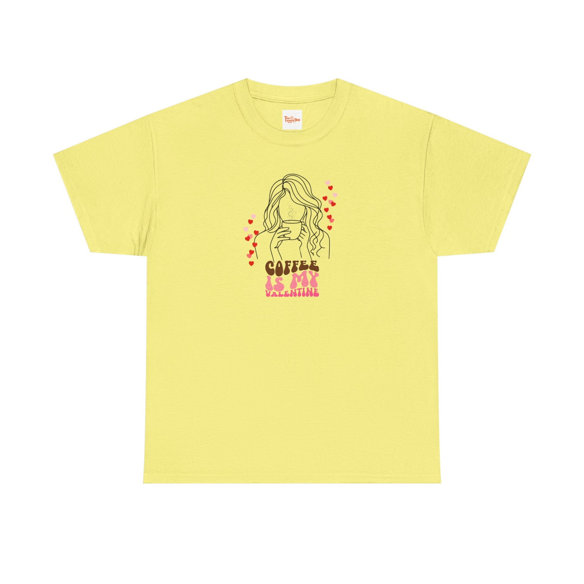 A coffee-themed graphic T-Shirt featuring a woman with a cup of coffee, perfect for coffee lovers and Valentine's Day enthusiasts. This T-Shirt gives off a cozy and casual vibe, ideal for adding a touch of fun to everyday outfits or celebrating the holiday in style.