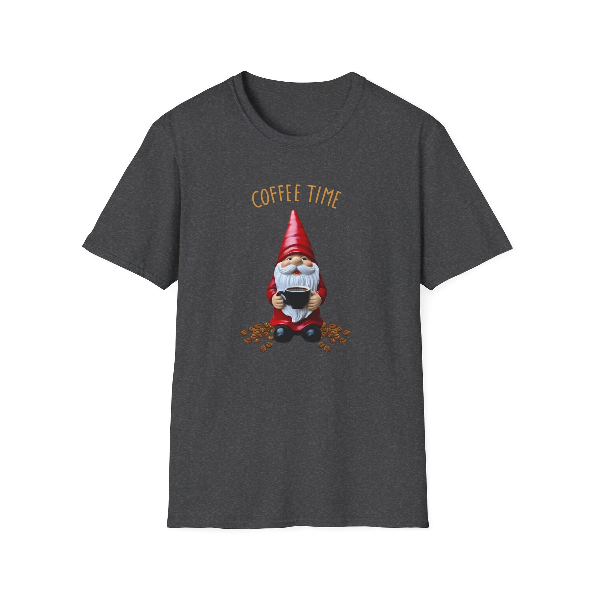 A cozy and stylish graphic T-Shirt featuring a gnome in red holding a cup of coffee. Perfect for coffee lovers and anyone who enjoys a whimsical touch in their wardrobe. Ideal for casual wear and lounging at home, this tee is great for coffee enthusiasts and gnome fans. Suitable for everyday wear and makes a fun gift for birthdays, holidays, or any occasion.