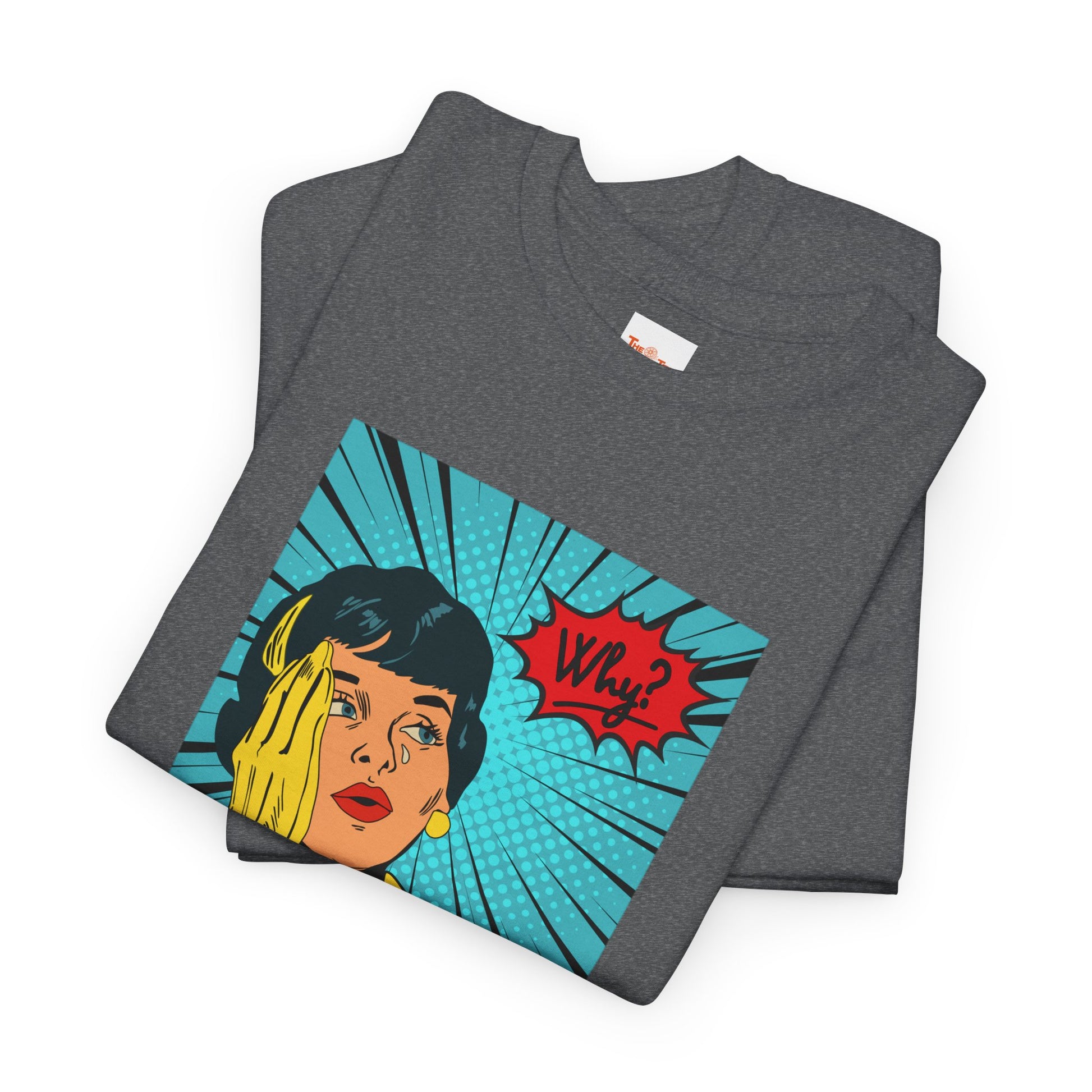 A tee featuring a comic book damsel asking why, giving off a quirky and fun vibe. This shirt is perfect for fans of comics and pop culture, adding a touch of humor to their wardrobe. Ideal for casual wear or as a statement piece for gatherings and events.
