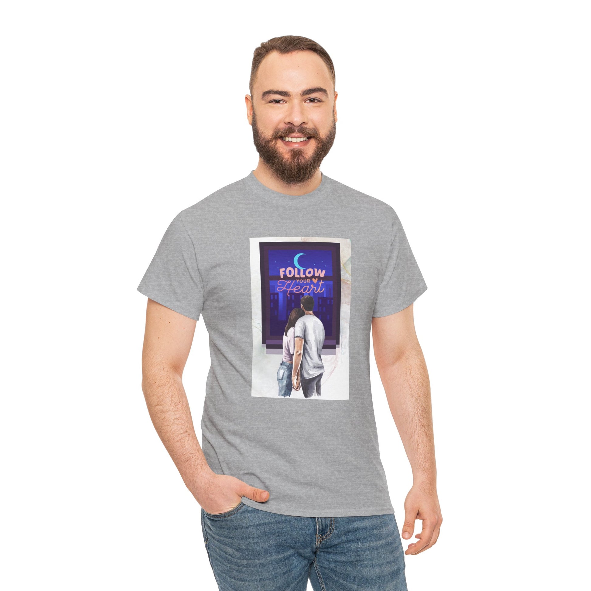 A unisex heavy cotton T-shirt featuring a graphic of a couple standing before a window at night, giving off a romantic and dreamy vibe. This tee is perfect for those who believe in following their hearts and is relevant for Valentine's Day, anniversaries, or date nights. Target audience includes adults looking for a comfortable and durable shirt for year-round wear.