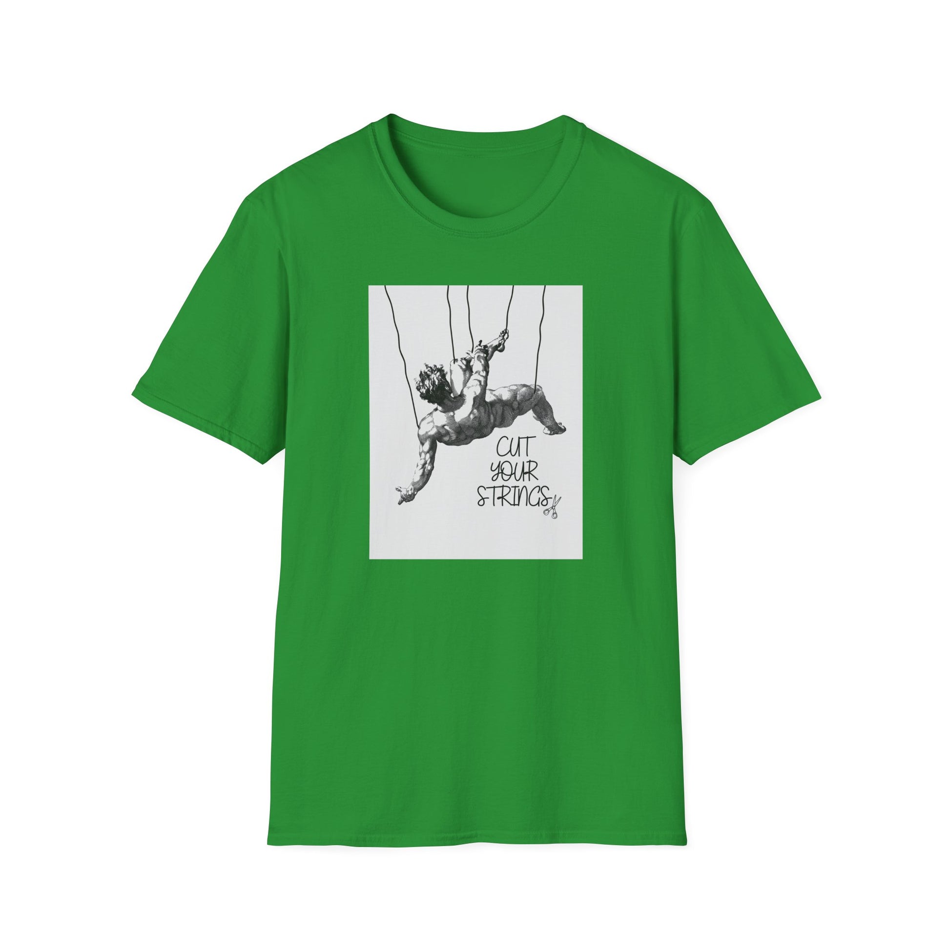 Cut Your Strings T-Shirt features a graphic of a man being suspended on strings, giving a unique and edgy vibe. Perfect for those who love surreal and thought-provoking designs. This T-Shirt is ideal for casual wear or making a statement at events such as art exhibitions or music festivals.