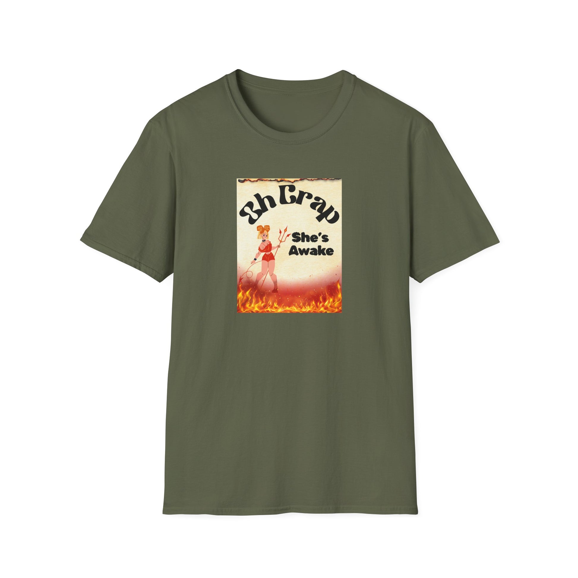 This T-Shirt features a graphic of a female demon standing in flames with the humorous phrase 'Oh Crap She's Awake'. It exudes a edgy and bold vibe, perfect for those who love dark humor and unique designs. Ideal for adults who appreciate a touch of darkness in their wardrobe, this shirt is great for Halloween, metal concerts, or everyday wear for those with a rebellious spirit.