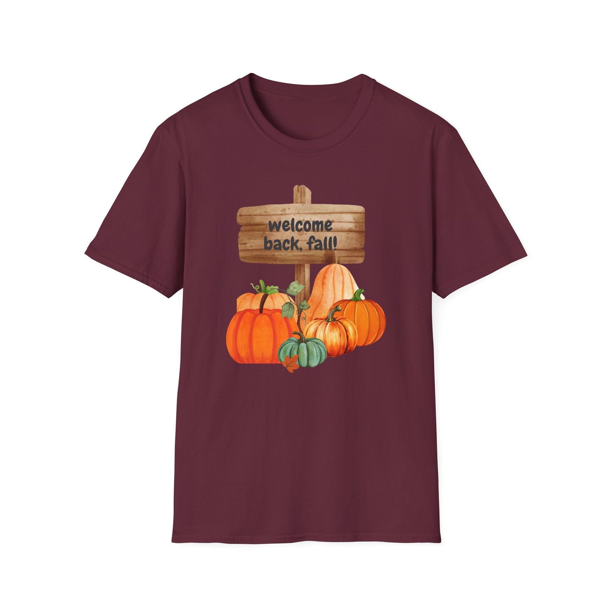 A cozy unisex softstyle T-Shirt featuring a graphic of pumpkins grouped around a sign, welcoming the Fall season. Perfect for those who enjoy autumn vibes and want to embrace the season in style. Ideal for adults looking to add a festive touch to their wardrobe, especially relevant for Halloween and Thanksgiving celebrations.