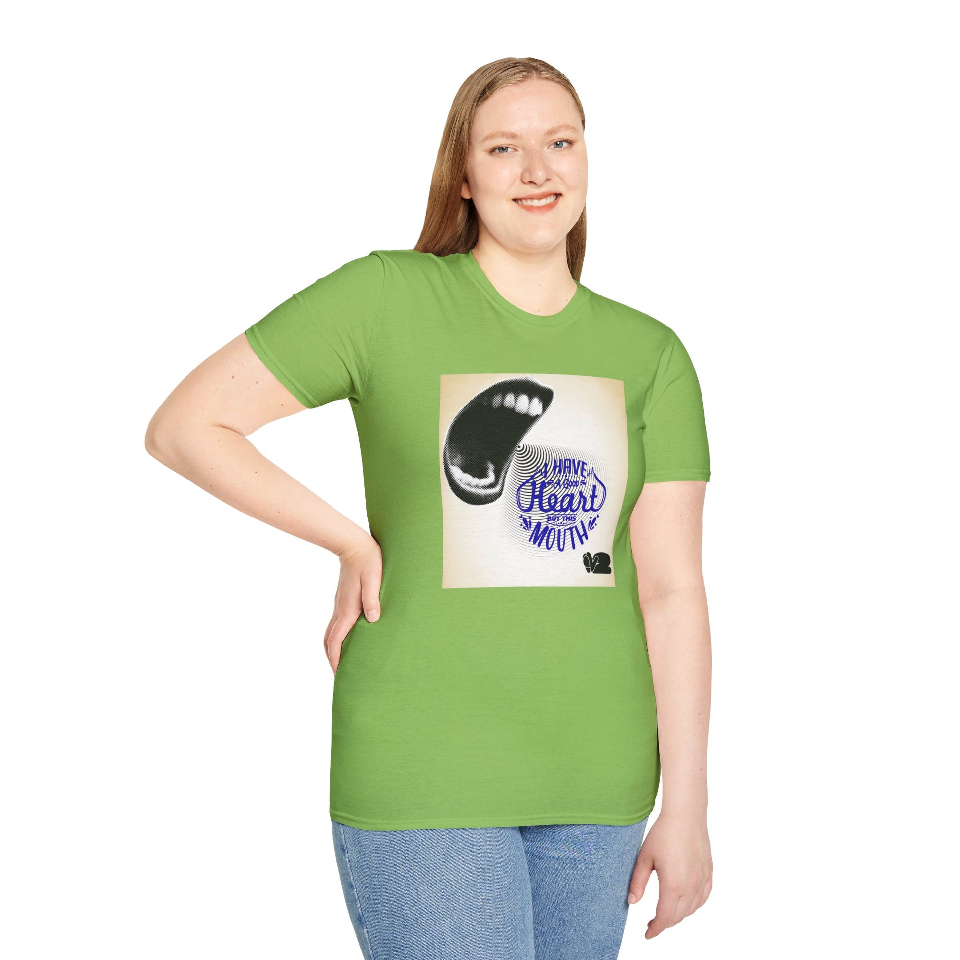 A bold and edgy Unisex Softstyle T-Shirt featuring a graphic of a screaming mouth and a cowering man. This shirt exudes a rebellious and confident vibe, perfect for those with a good heart but a tough exterior. Ideal for adults looking to make a statement with their clothing, great for casual wear or as a conversation starter. Relevant for occasions like parties, concerts, or everyday street style.