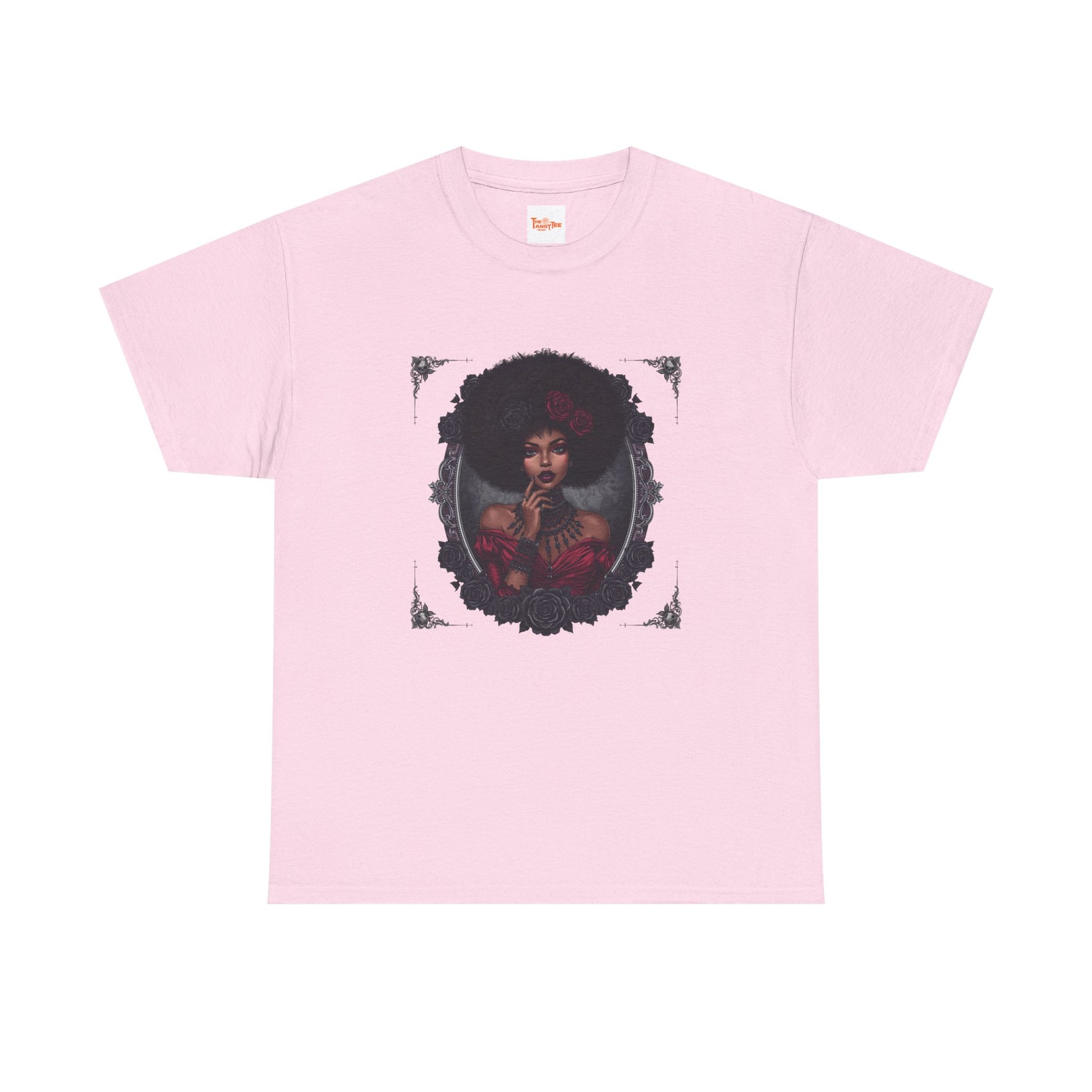 This tee centers a bold, gothic-inspired portrait of a Black woman crowned with a voluminous afro, framed by lush roses. It’s more than an image — it’s an attitude: quiet strength, midnight elegance, and rooted beauty. Wear it on slow city nights, at gallery openings, or while sharing stories over coffee. The heavyweight cotton holds the print’s deep blacks and rich reds, so the portrait stays sharp after washes. The classic crew neck and relaxed fit make it easy to layer under a leather jacket or let it stand alone as a statement piece. It feels like a poem in fabric — moody, resilient, and unapologetically personal.