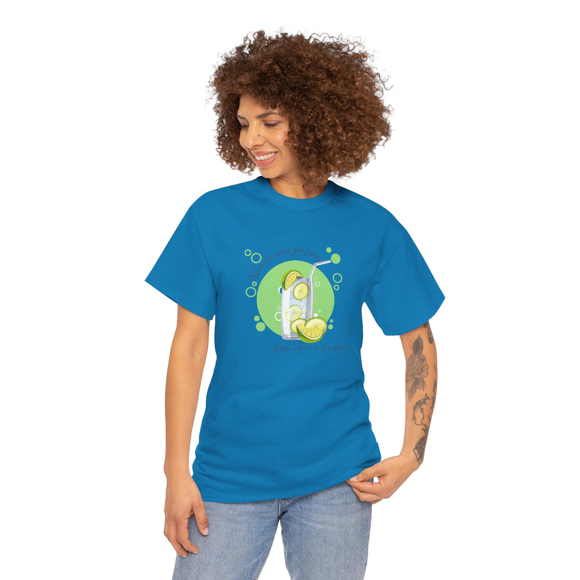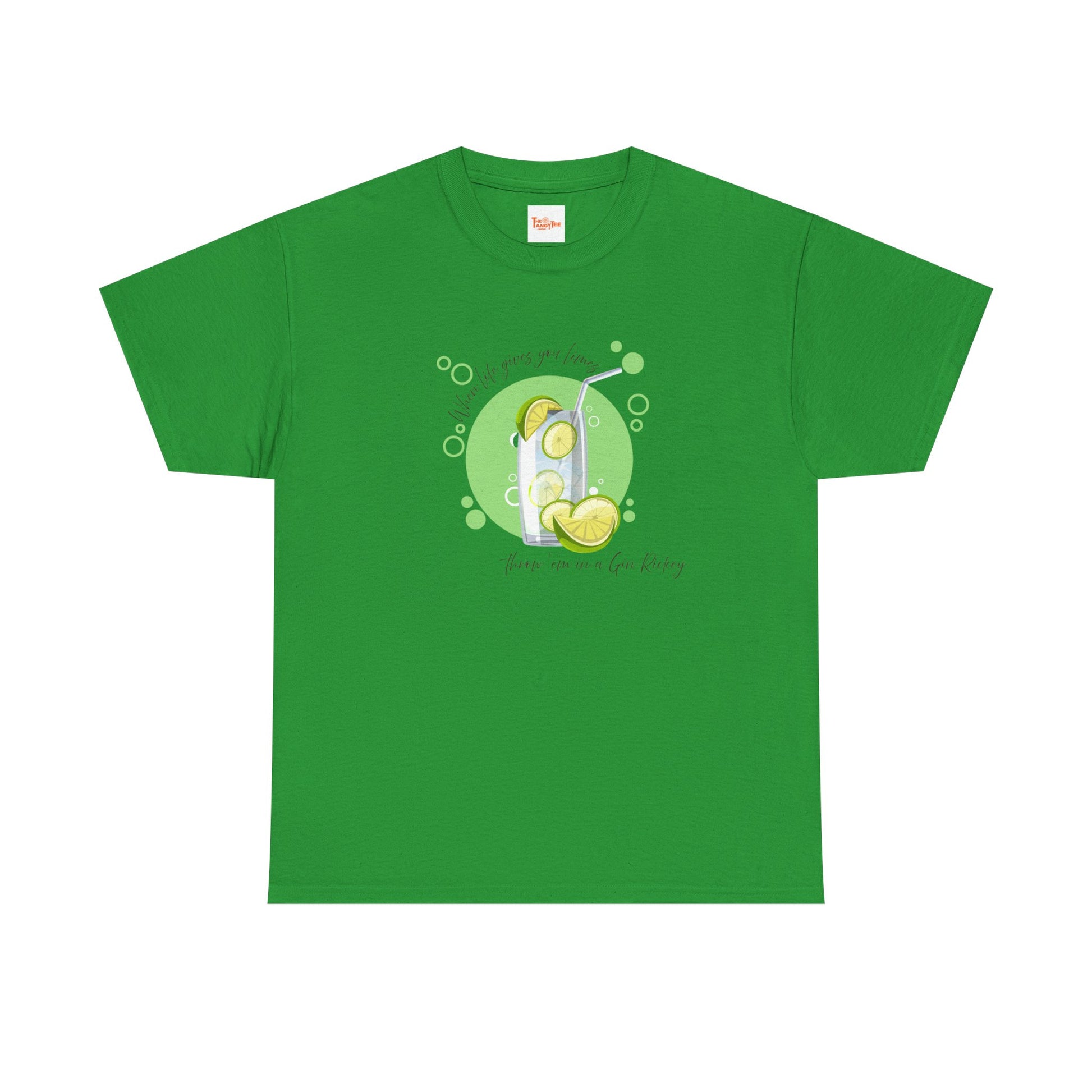 A classic fit T-shirt made from 100% cotton fabric, perfect for printing. Featuring a graphic of a cocktail with the text 'When life gives you lemons, throw 'em in a gin rickey'. This tee offers year-round comfort with lasting durability, ideal for casual wear. Suitable for adults and relevant for summer parties, happy hours, and cocktail enthusiasts.