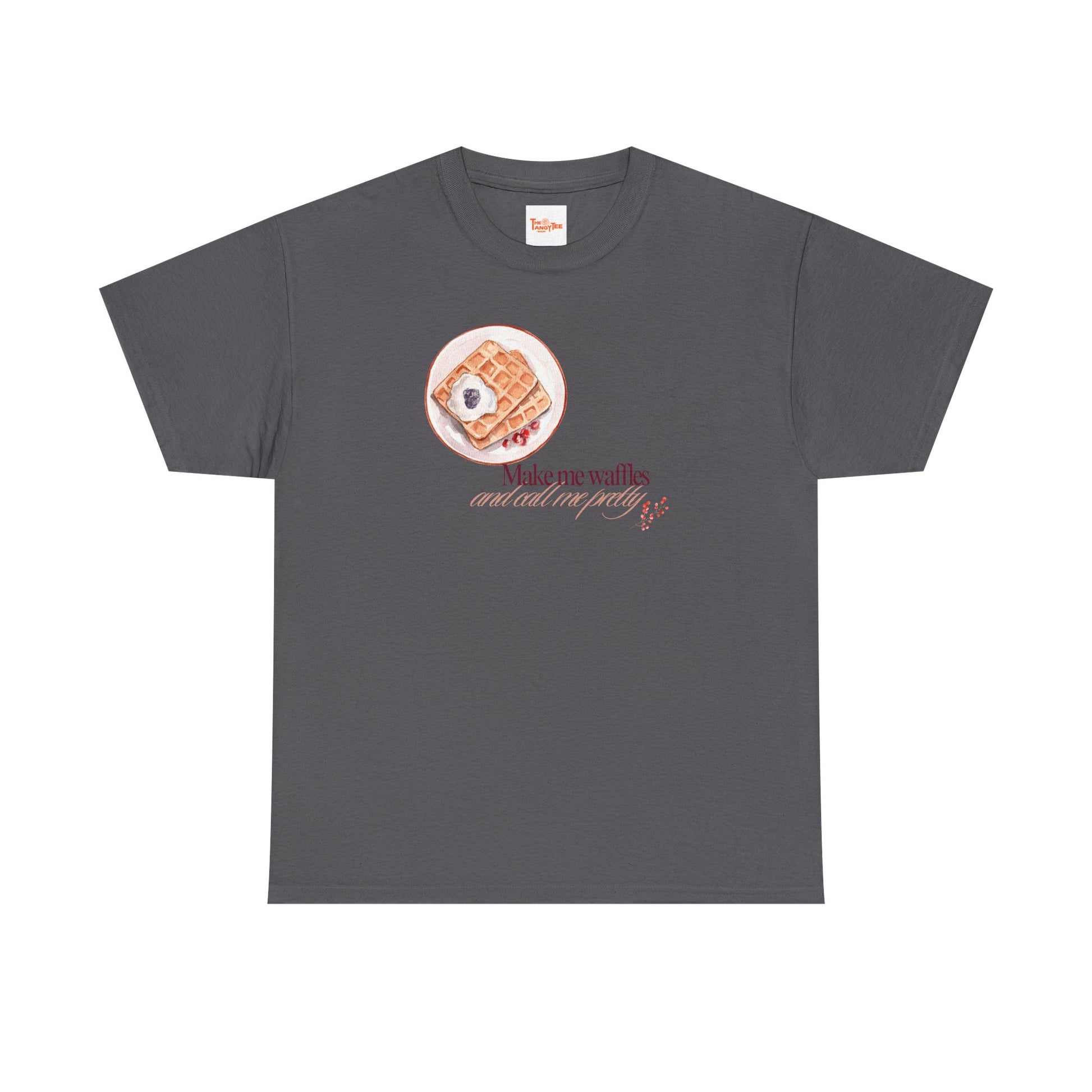 A comfortable and versatile T-Shirt featuring a graphic of a plate of waffles with the quote 'Make me waffles and call me pretty'. This fun and quirky tee exudes a casual and laid-back vibe, perfect for lounging at home or running errands. Ideal for adults looking to add a touch of humor to their everyday wardrobe. Relevant for breakfast enthusiasts, foodies, and those who appreciate playful designs. Perfect for gifting on birthdays, Valentine's Day, or as a fun surprise for a loved one.