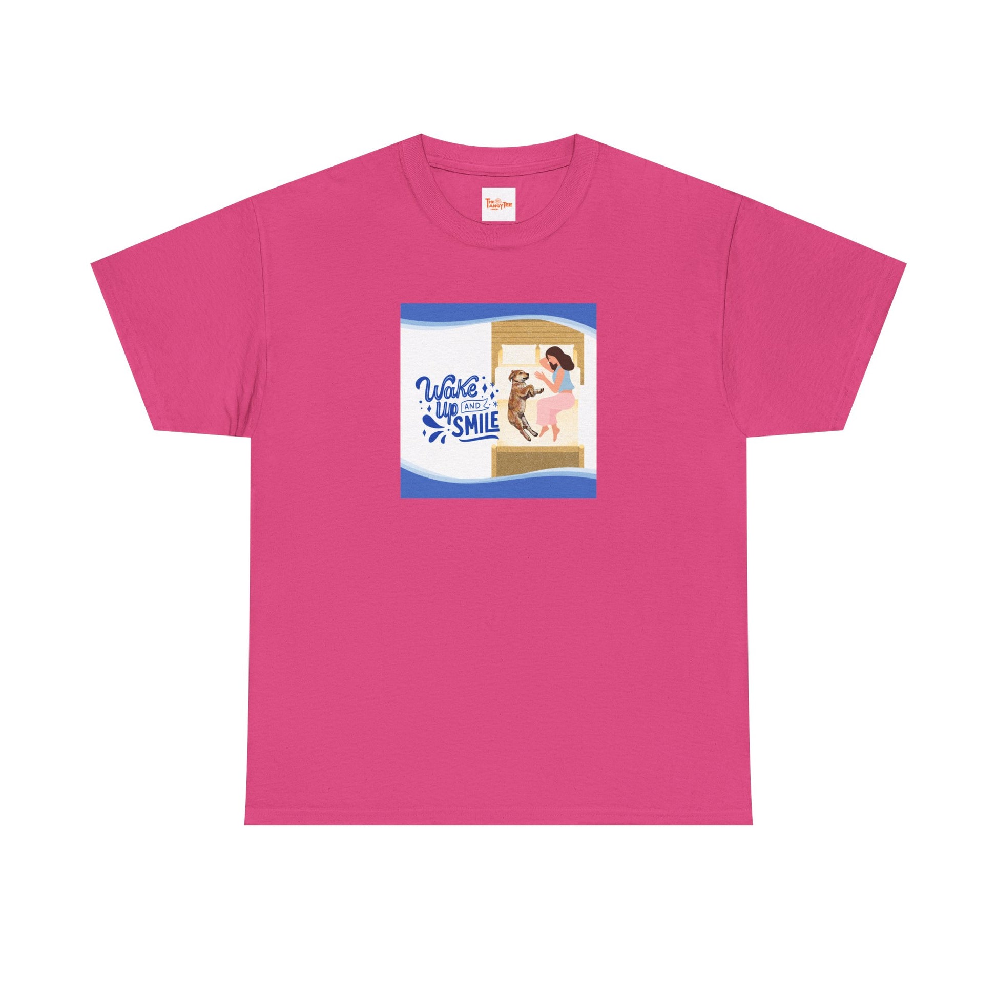 Graphic Tee - Wake up and Smile, Woman and Dog in Bed Design