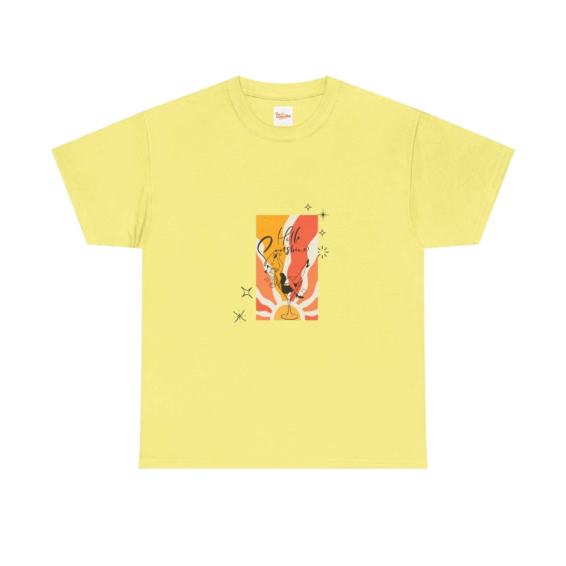 This T-Shirt features a graphic of a woman in a cocktail glass with the words 'Hello Sunshine'. It exudes a fun and playful vibe, perfect for casual outings or lounging at home. Ideal for adults, this tee is made from high-quality, strong fabric that is perfect for printing. With a classic fit and tear-away label, it ensures comfort and style. Suitable for sunny days, vacations, beach trips, or summer parties.
