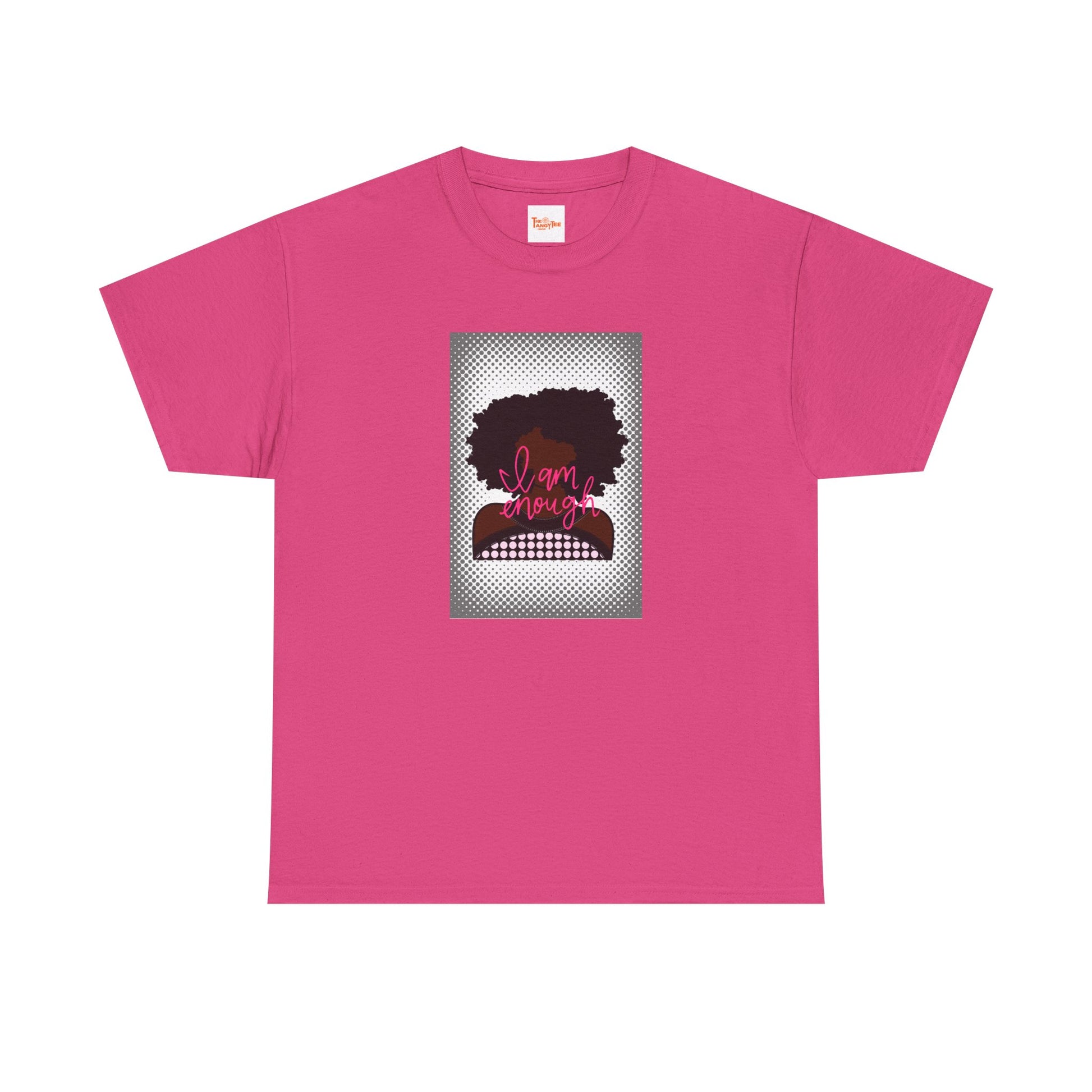 Empowering graphic tee featuring the phrase 'I am Enough' and a black woman with natural hair. This tee exudes confidence and positivity, perfect for anyone looking to embrace their self-worth. Ideal for individuals who appreciate empowering messages and celebrate diversity. Suitable for everyday wear, as well as for events promoting self-love and empowerment.
