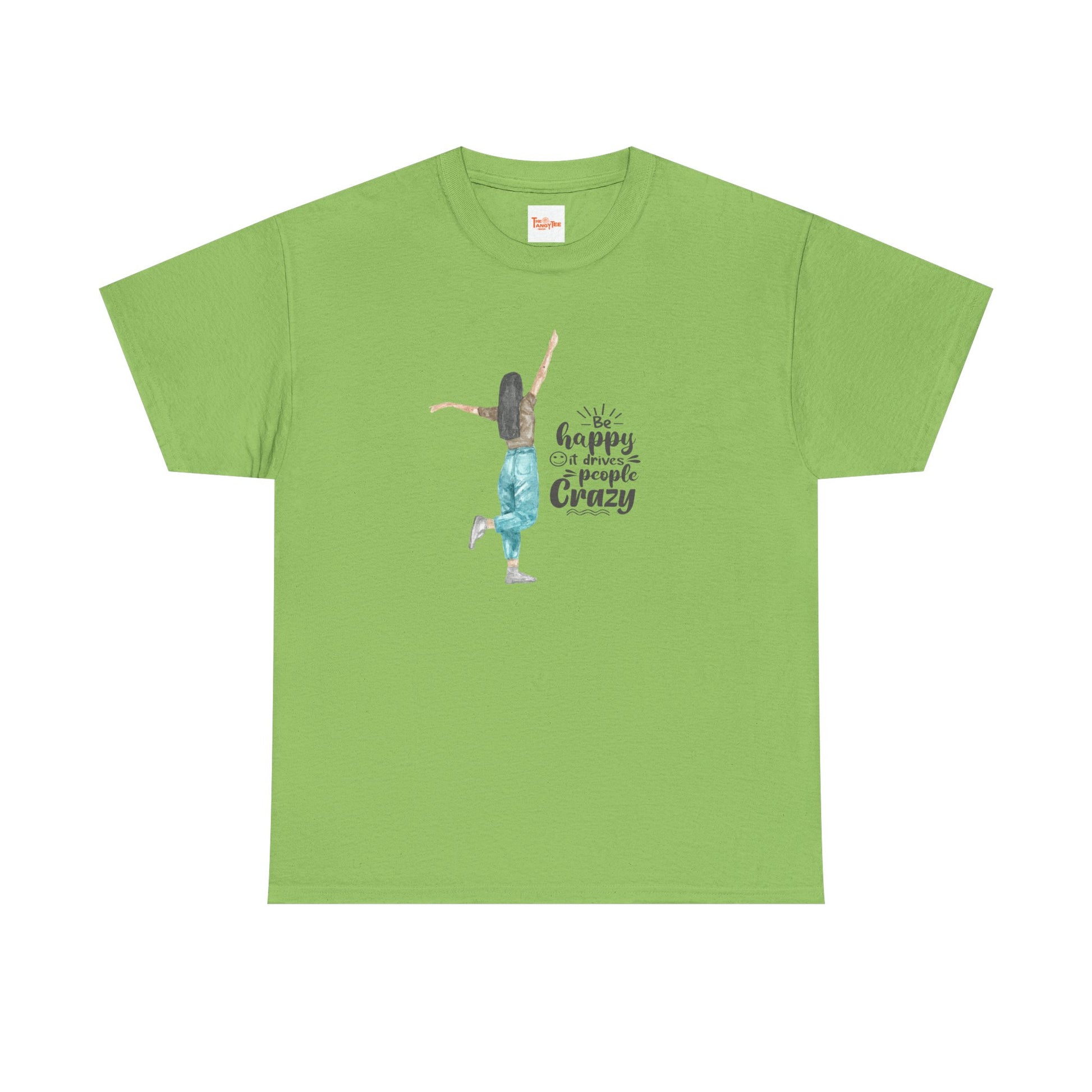 Spread joy and positivity with this Be Happy graphic tee featuring a joyful woman. Perfect for those who want to drive people crazy with happiness. Ideal for casual wear or to make a statement on special occasions and holidays.