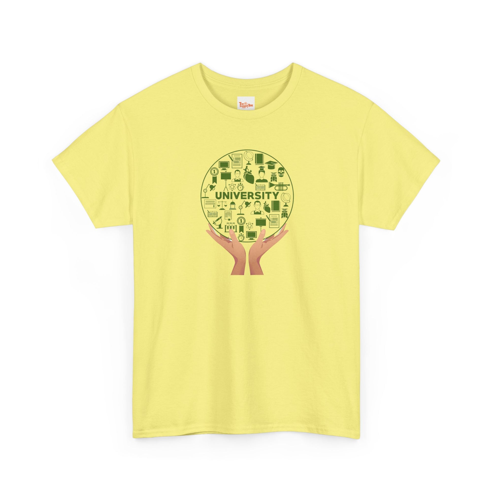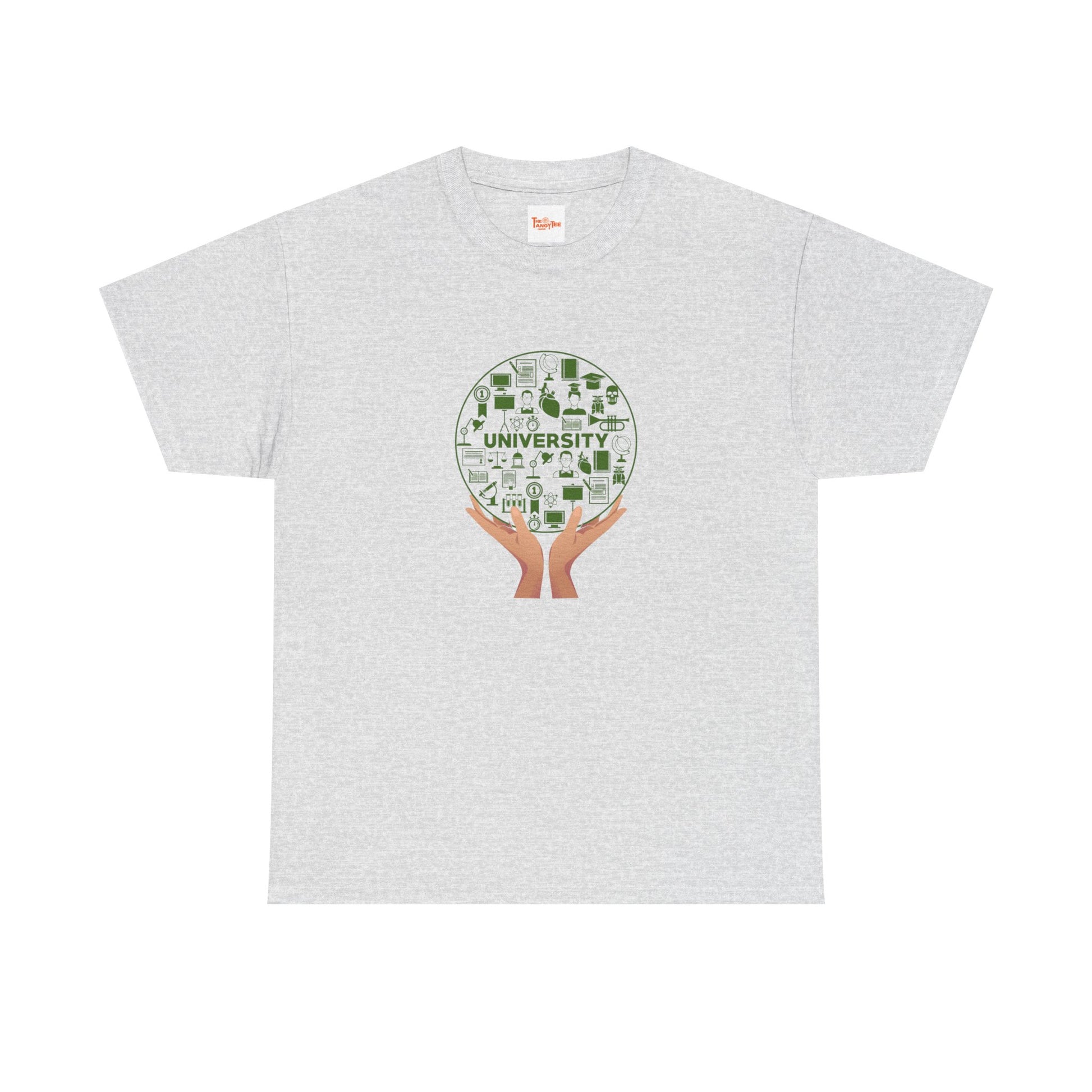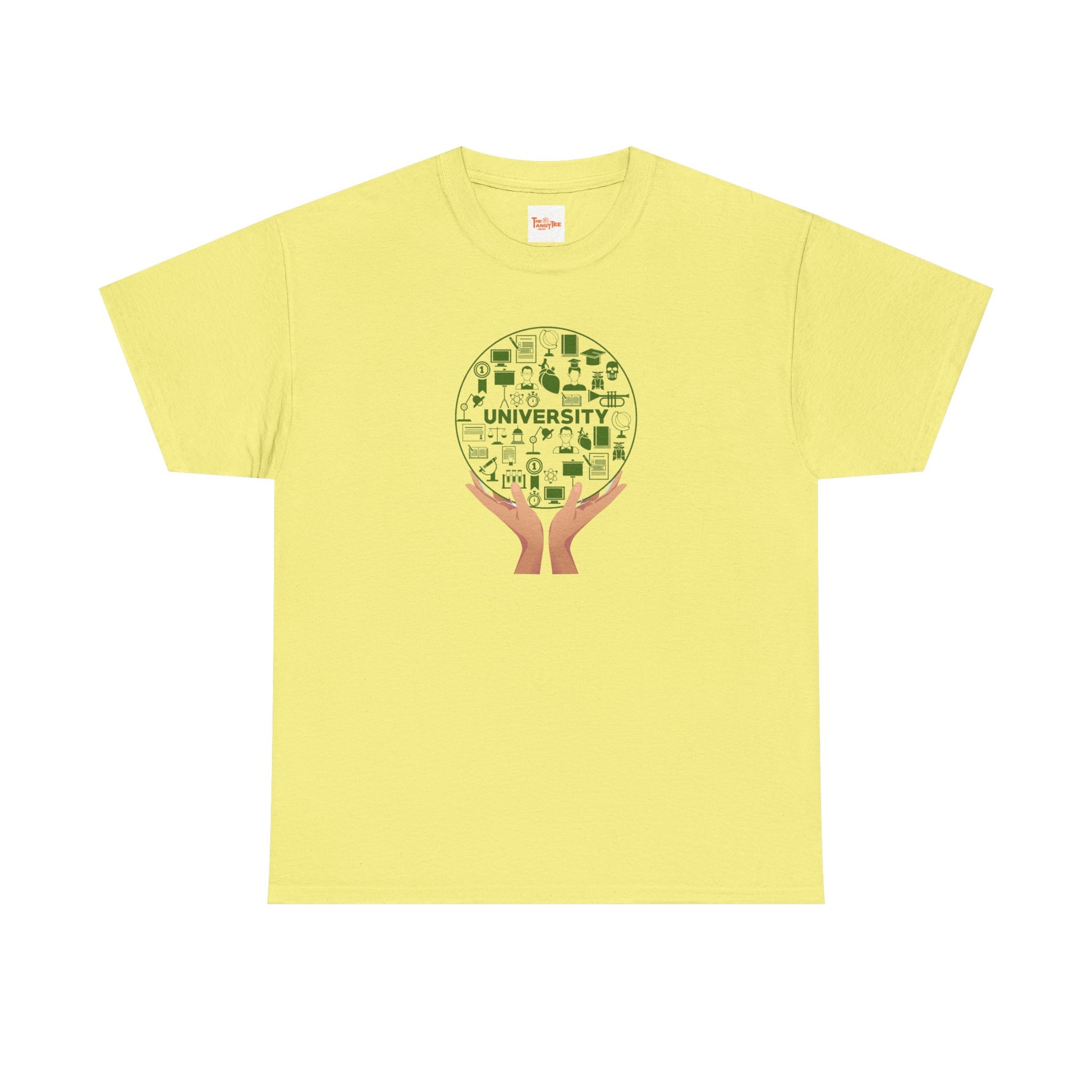 This T-Shirt features a graphic of a hand holding up a globe full of university objects, giving off a vibe of knowledge and curiosity. Perfect for those who love learning and exploring new things. Ideal for students, teachers, academics, and world travelers. Relevant for Back to School, Graduation, Earth Day, and World Teachers' Day.