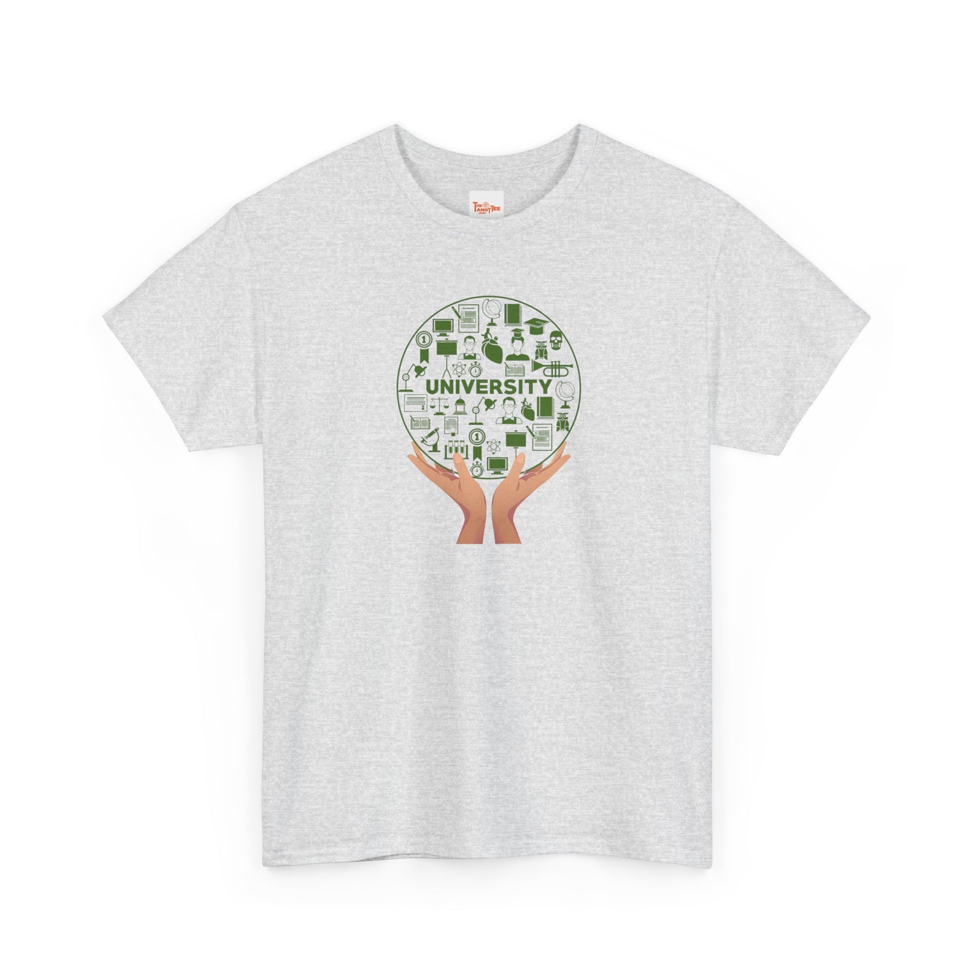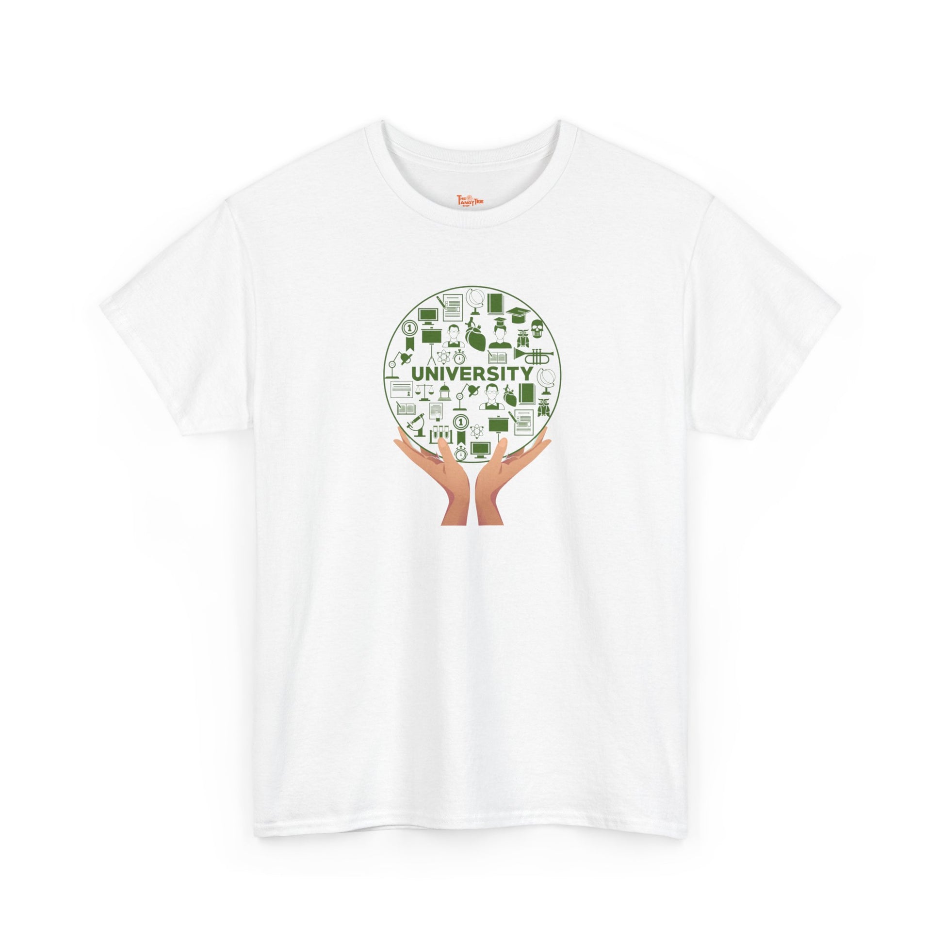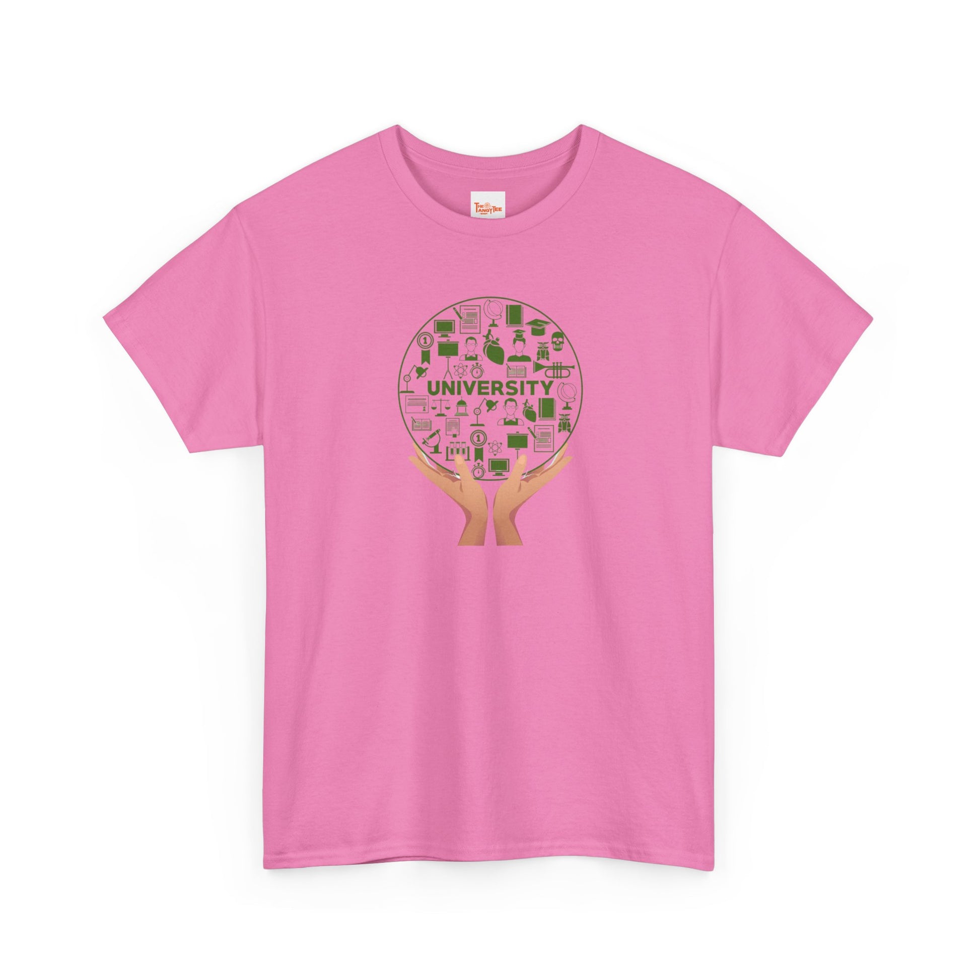 This T-Shirt features a graphic of a hand holding up a globe full of university objects, giving off a vibe of knowledge and curiosity. Perfect for those who love learning and exploring new things. Ideal for students, teachers, academics, and world travelers. Relevant for Back to School, Graduation, Earth Day, and World Teachers' Day.