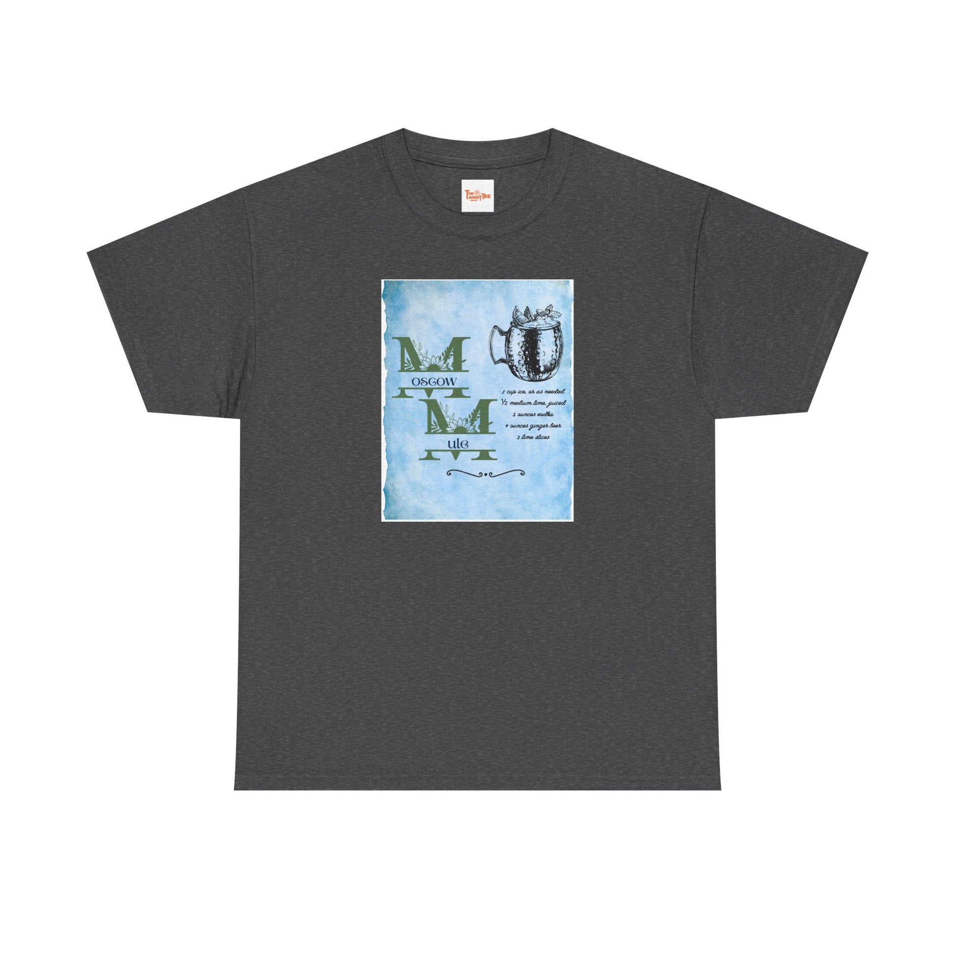 A Moscow Mule graphic tee with a cocktail recipe, perfect for cocktail enthusiasts and party-goers. This tee exudes a fun and vibrant vibe, making it suitable for casual gatherings, parties, and holiday celebrations.