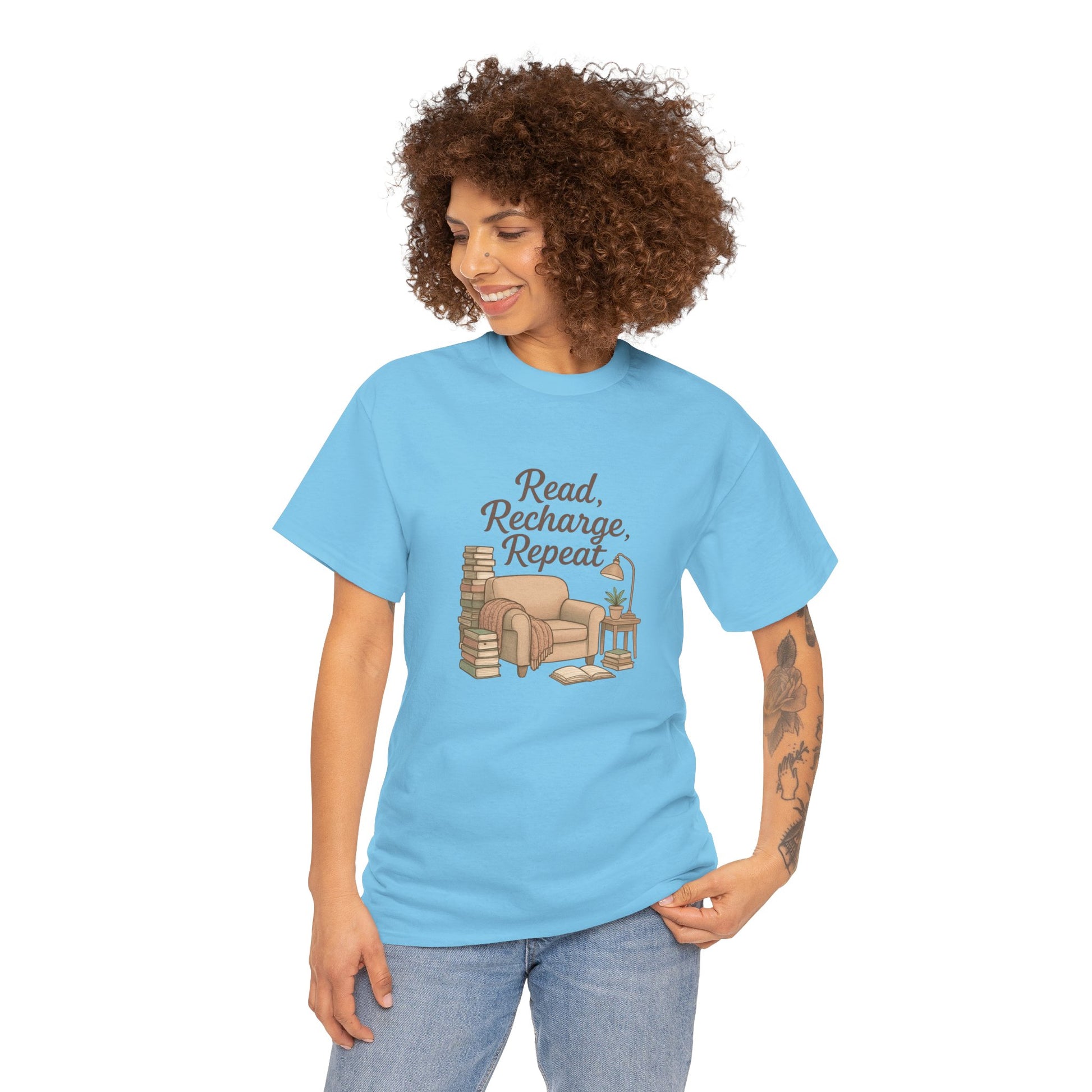 This T-Shirt features a graphic of a stack of books beside an armchair with the phrase 'Read Recharge Repeat'. Perfect for book lovers who enjoy cozy reading atmospheres. Ideal for those looking for a comfortable and stylish tee to wear casually or as a statement piece.