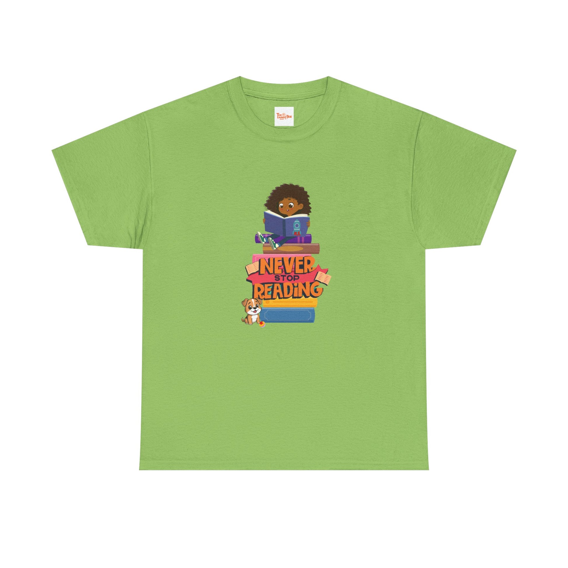 This Never Stop Reading tee features a graphic of a little girl atop a stack of books, making it perfect for book lovers and avid readers. The design brings a whimsical and inspiring vibe, fitting seamlessly into a casual and cozy wardrobe. Ideal for bookworms, teachers, librarians, and students, this tee is great for celebrating Book Lover's Day, World Book Day, and Back to School season.
