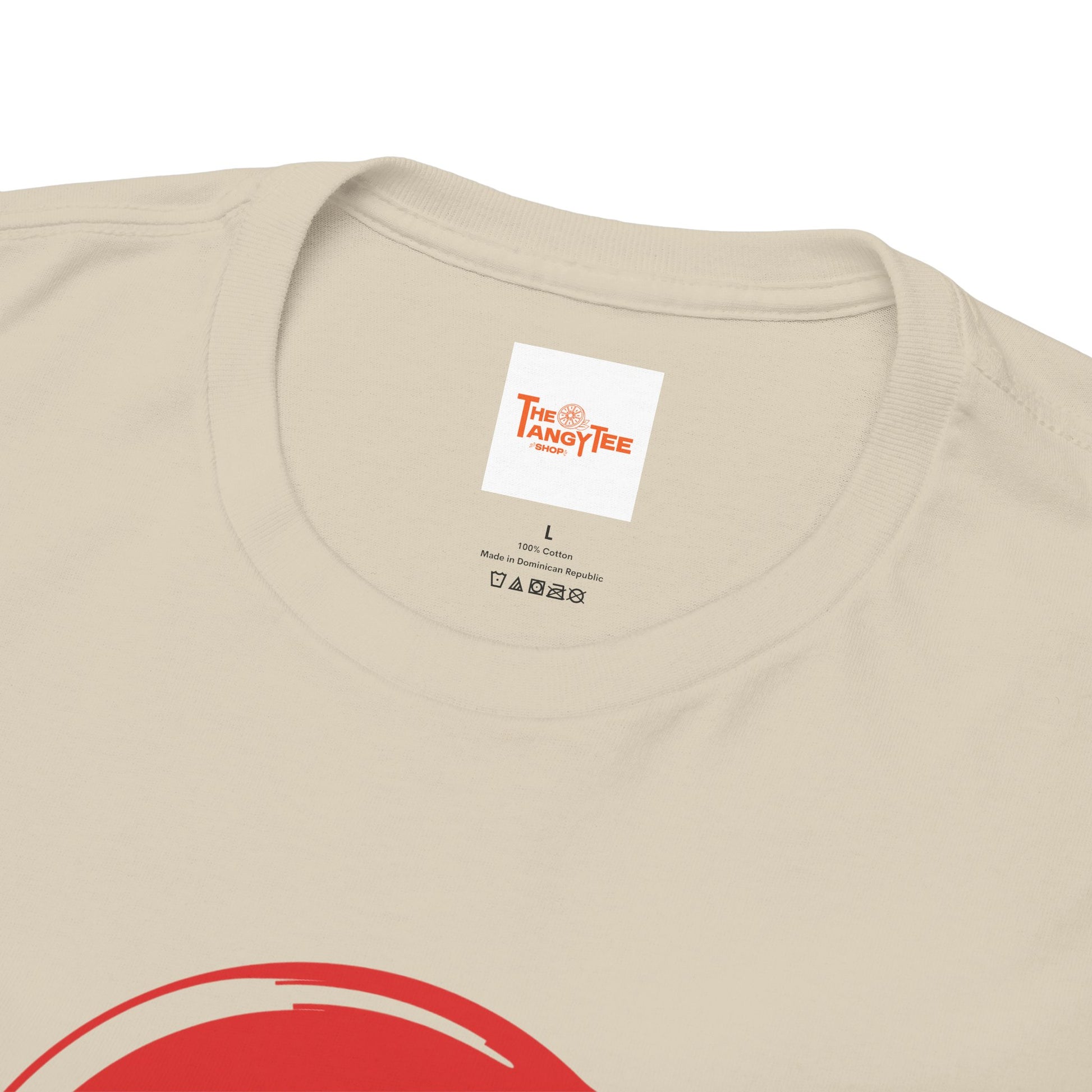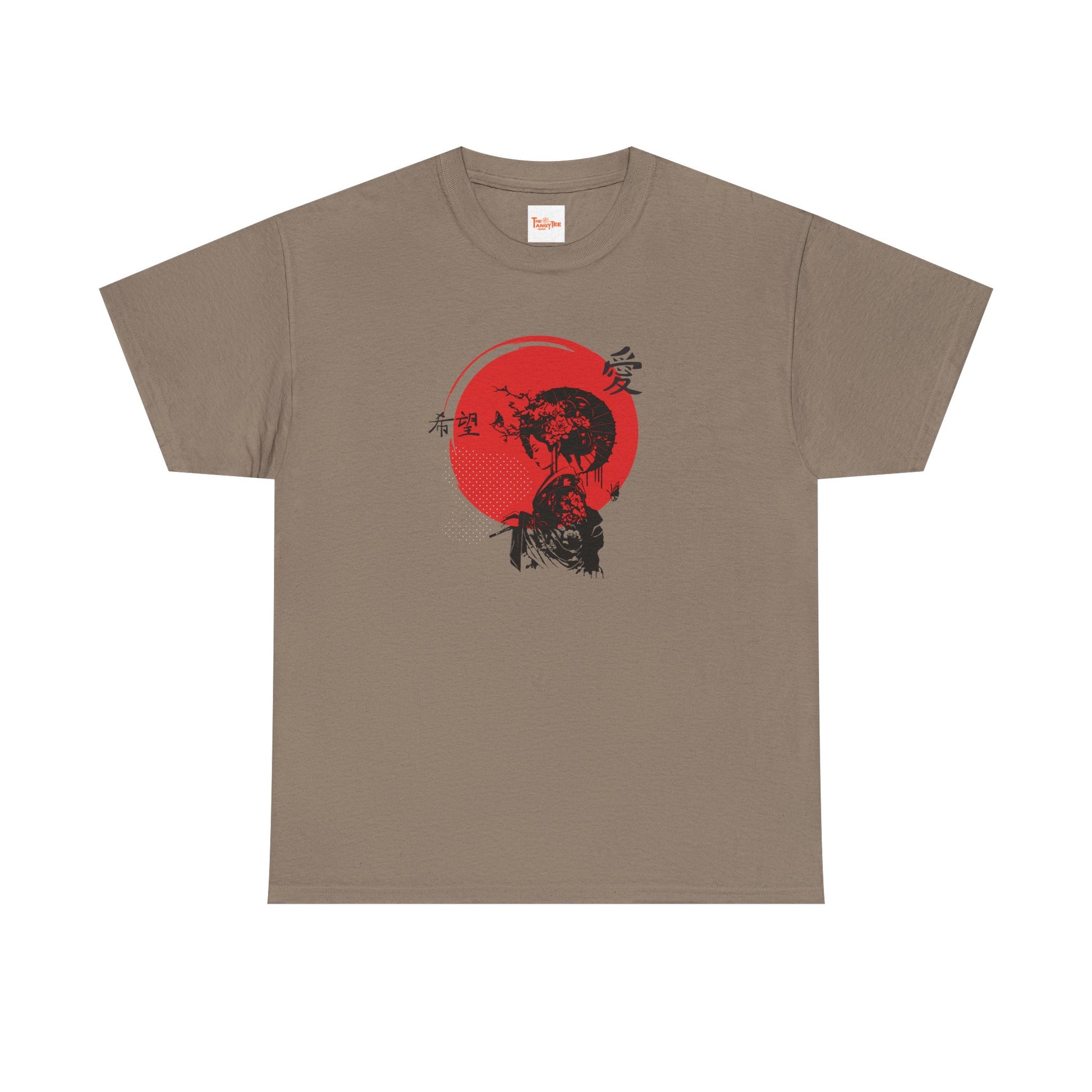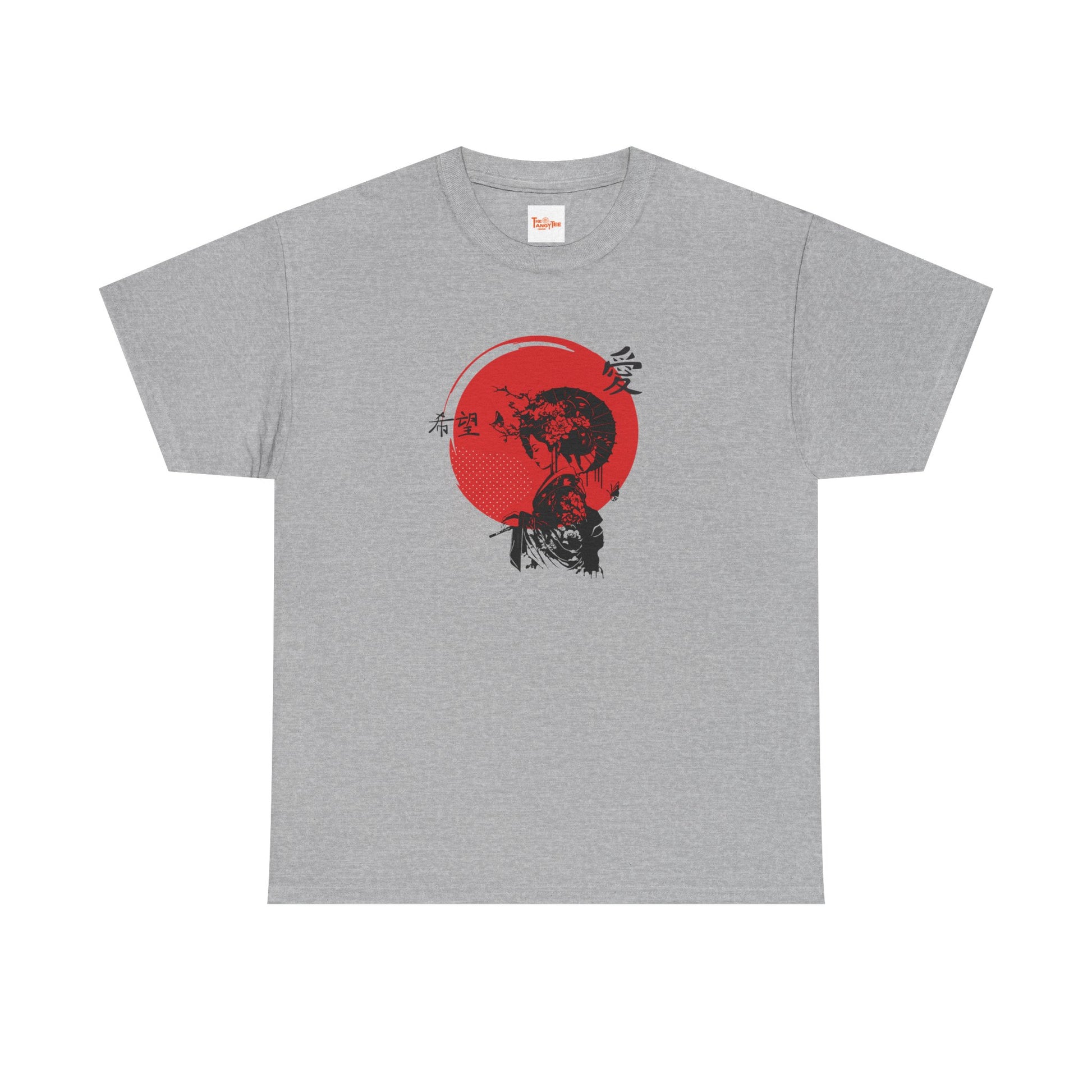 A versatile unisex heavy cotton tee featuring a graphic of a geisha against a red circle. The tee is made from specially spun fibers, providing a strong and smooth fabric perfect for printing. Suitable for adults, this tee is ideal for anyone looking for a comfortable and stylish garment.