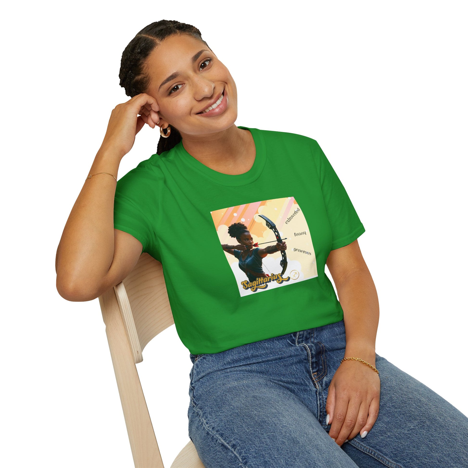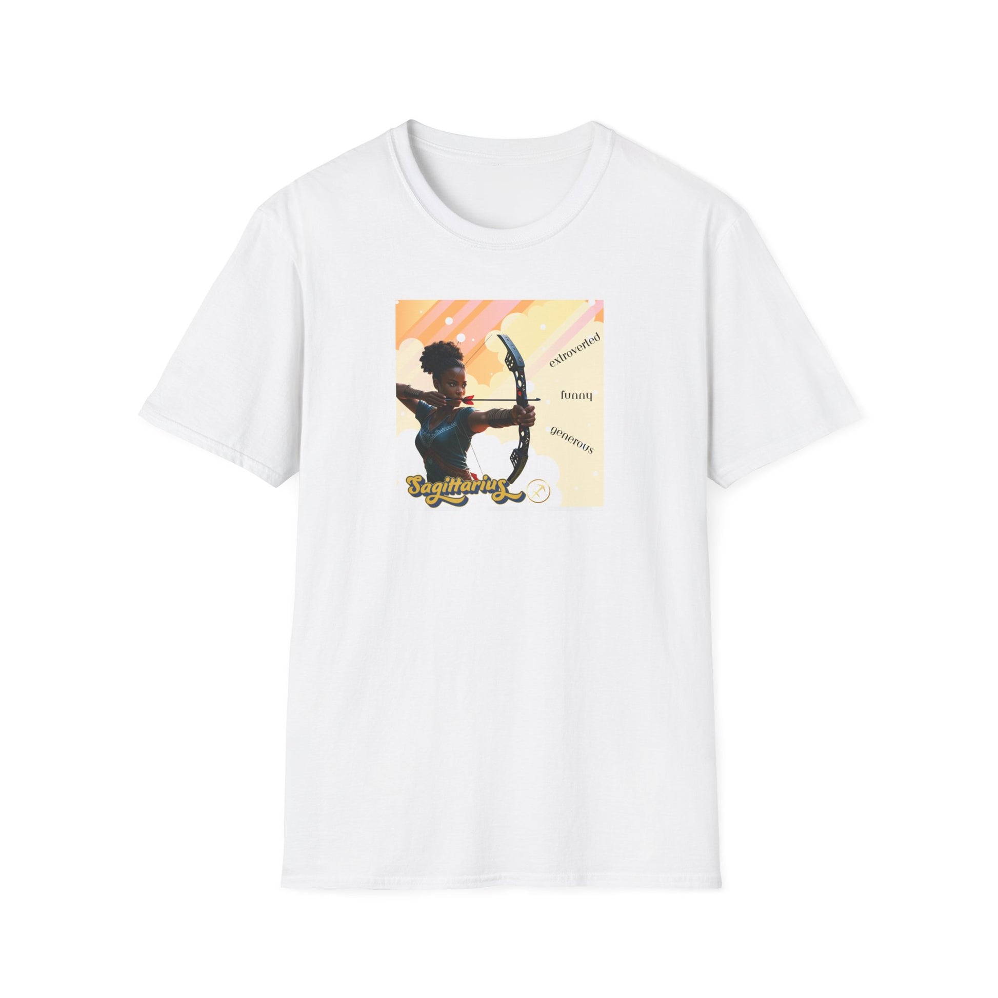 This Sagittarius themed T-Shirt features a graphic of an archer and the characteristics of the zodiac sign, perfect for astrology enthusiasts. Made from durable and smooth fabric, this unisex softstyle T-Shirt is ideal for printing. The classic fit and crew neckline make it versatile for any occasion.