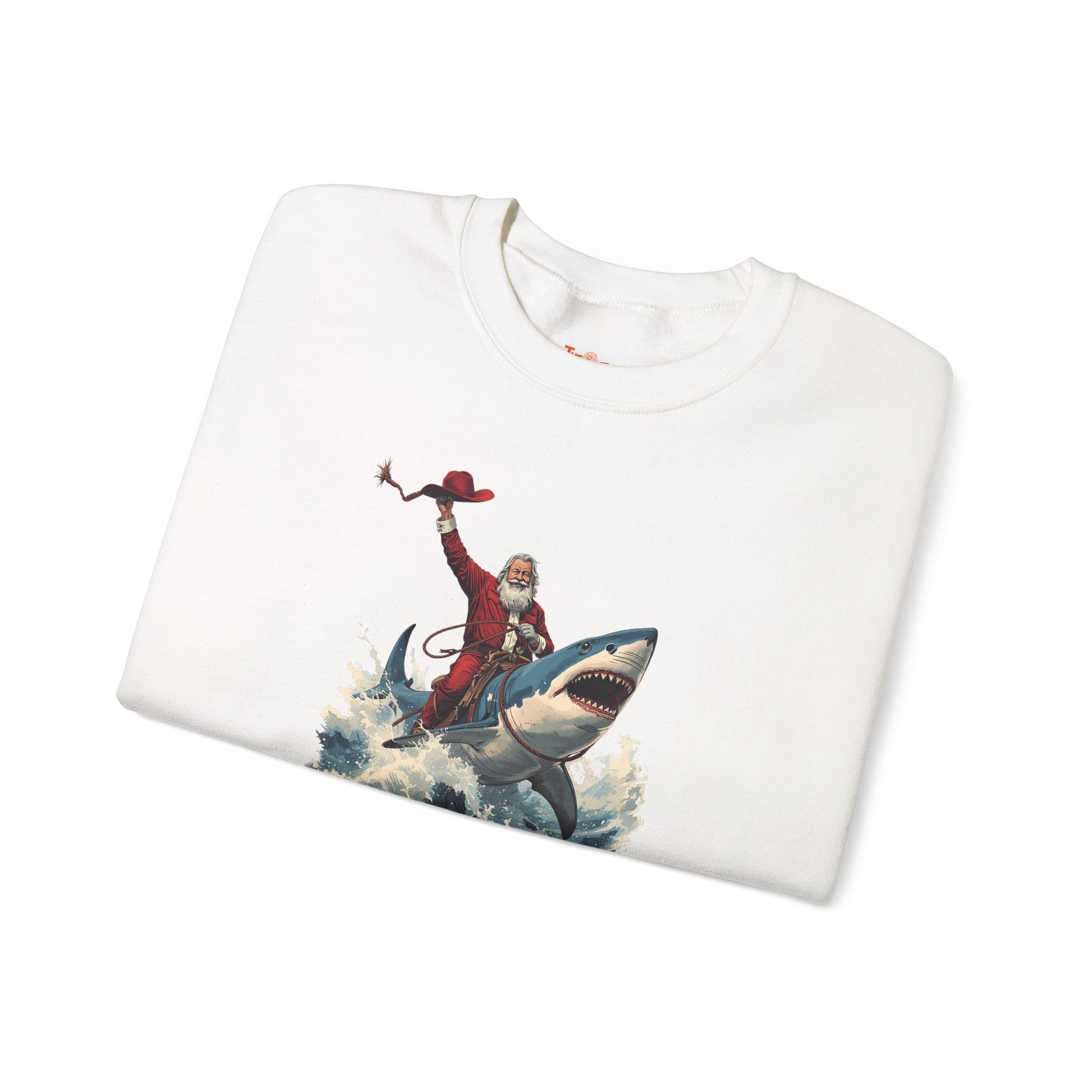Santa Riding a Shark Sweatshirt — Funny Holiday Shark Claus Crewneck
