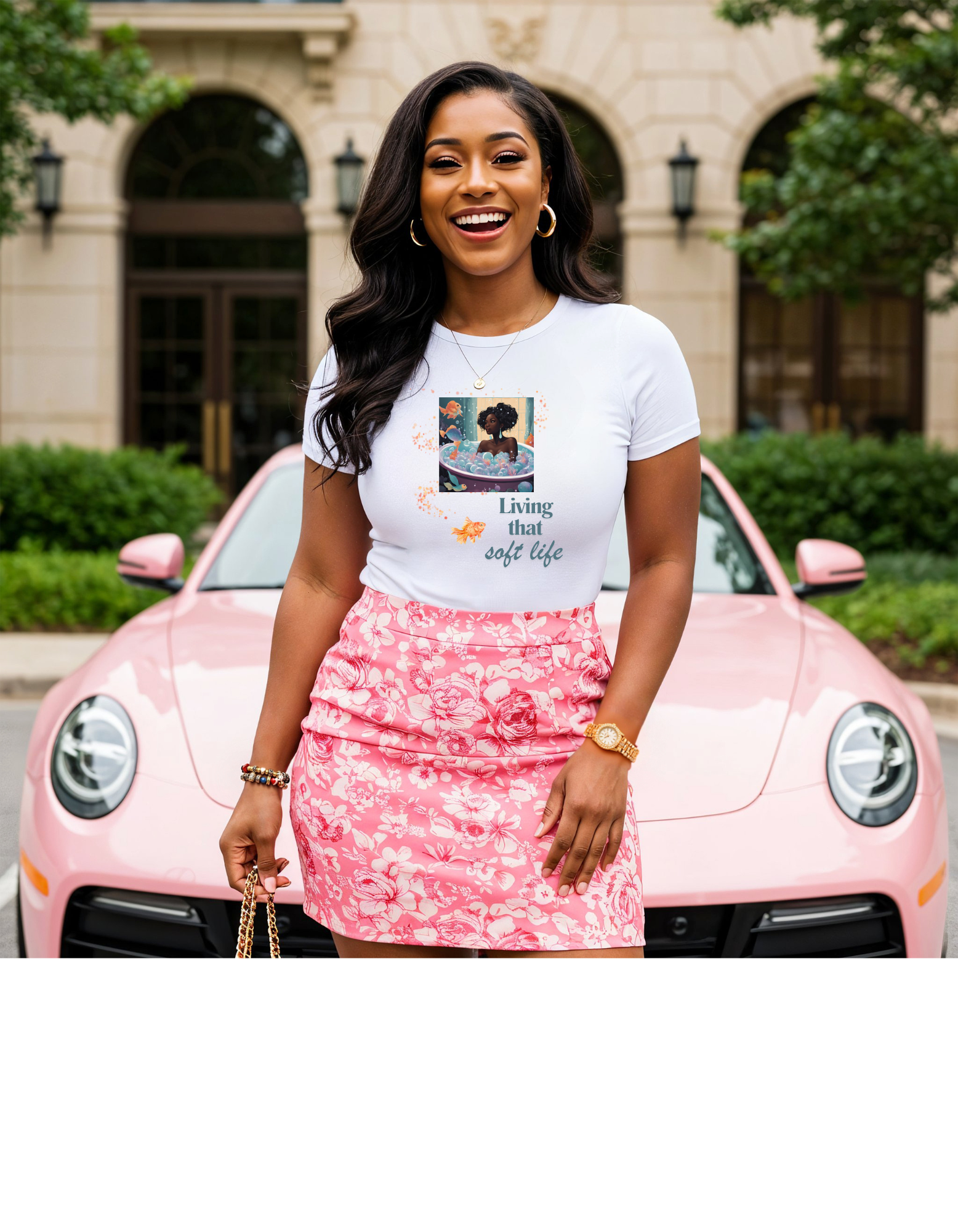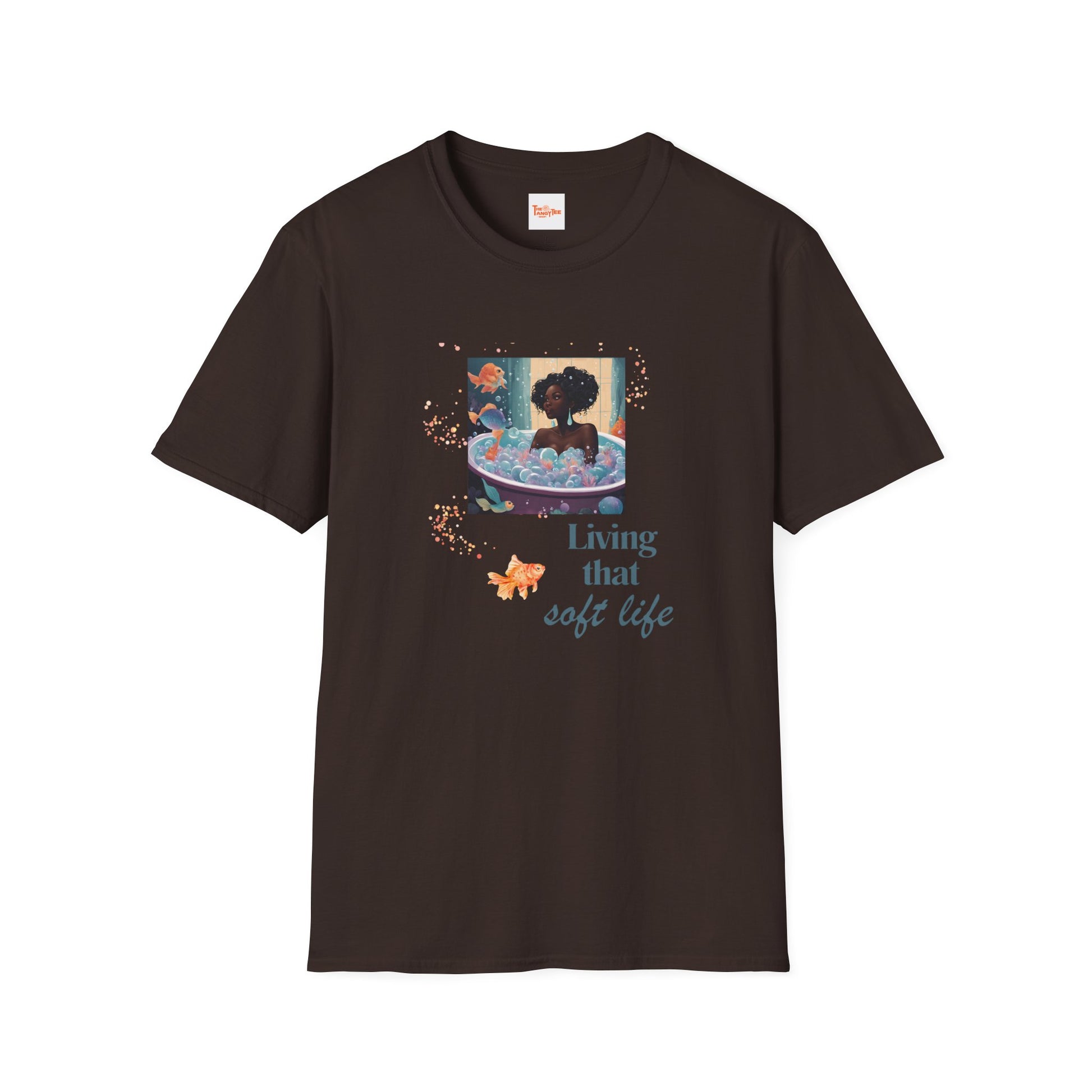 Soft Life Graphic Unisex T-Shirt - Black Woman in Bath with Goldfish and Bubbles