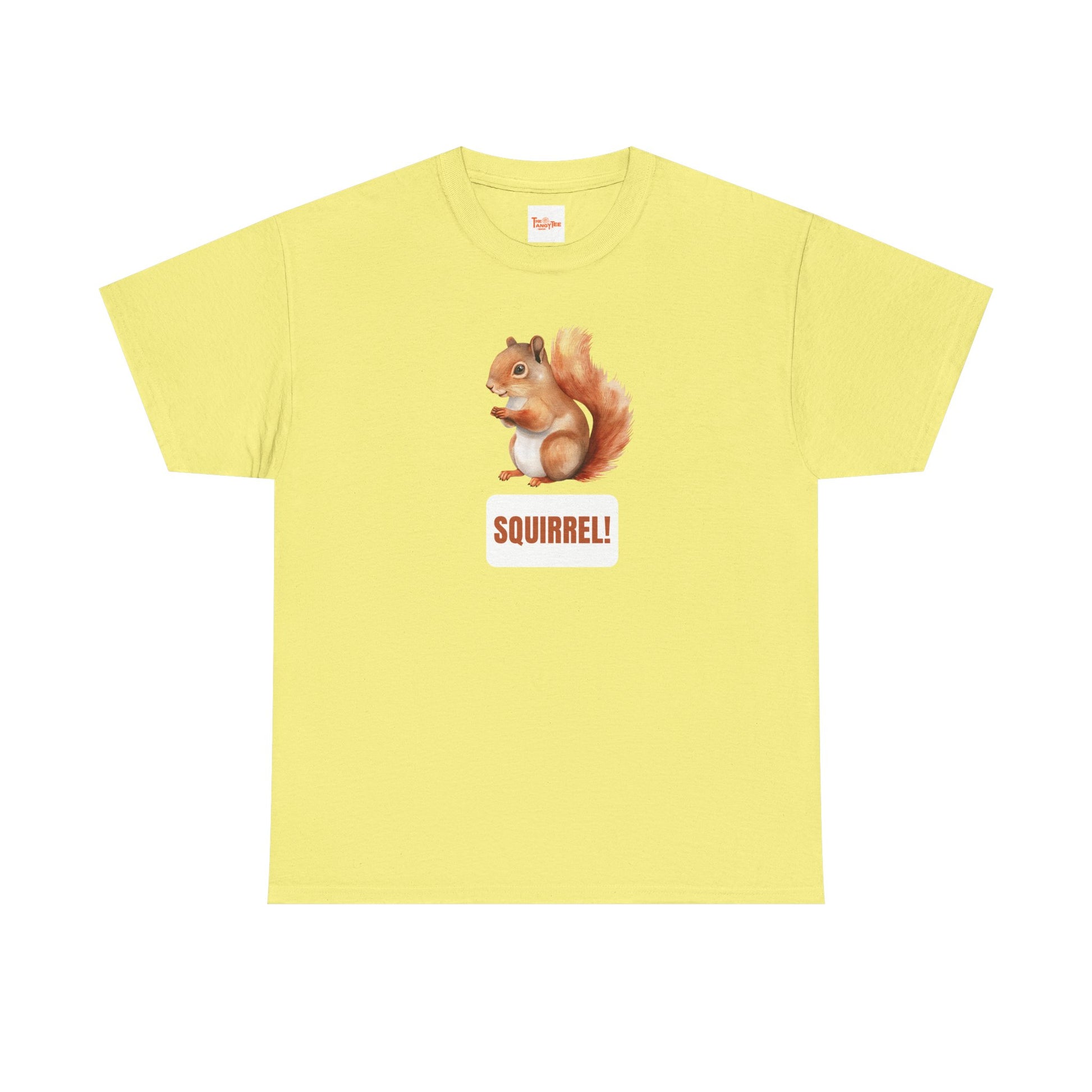 A classic unisex heavy cotton T-shirt featuring a graphic of a squirrel. This tee offers year-round comfort with durable fabric, perfect for printing. The ribbed knit collar and tear-away label ensure a comfy, neat wear for adults.