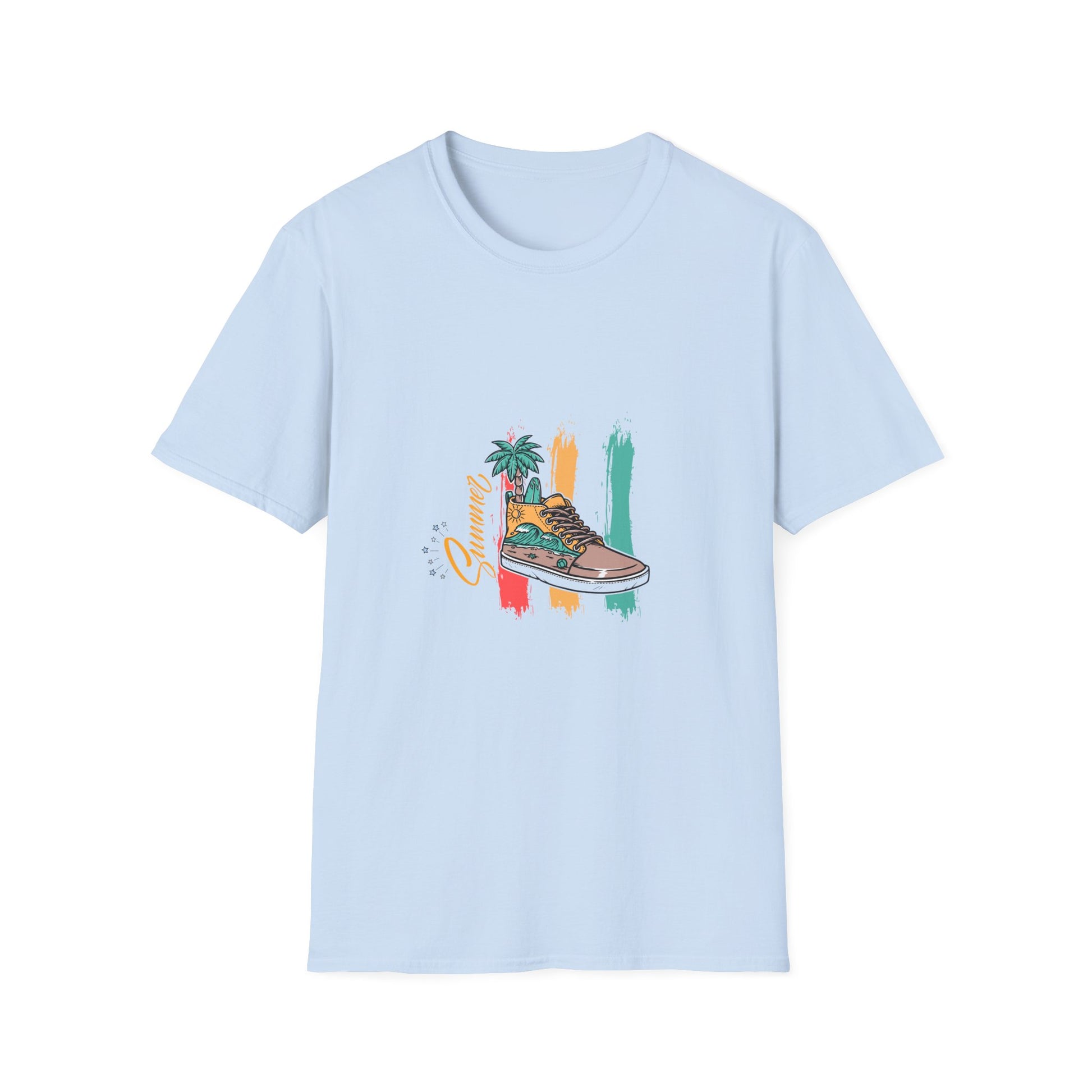 A summer-themed T-Shirt featuring a graphic of a shoe containing a surfboard and a palm tree. Perfect for beach lovers and surf enthusiasts, this T-Shirt exudes a relaxed and laid-back vibe, ideal for casual wear during summer. It is relevant for beach vacations, summer outings, and casual hangouts with friends.