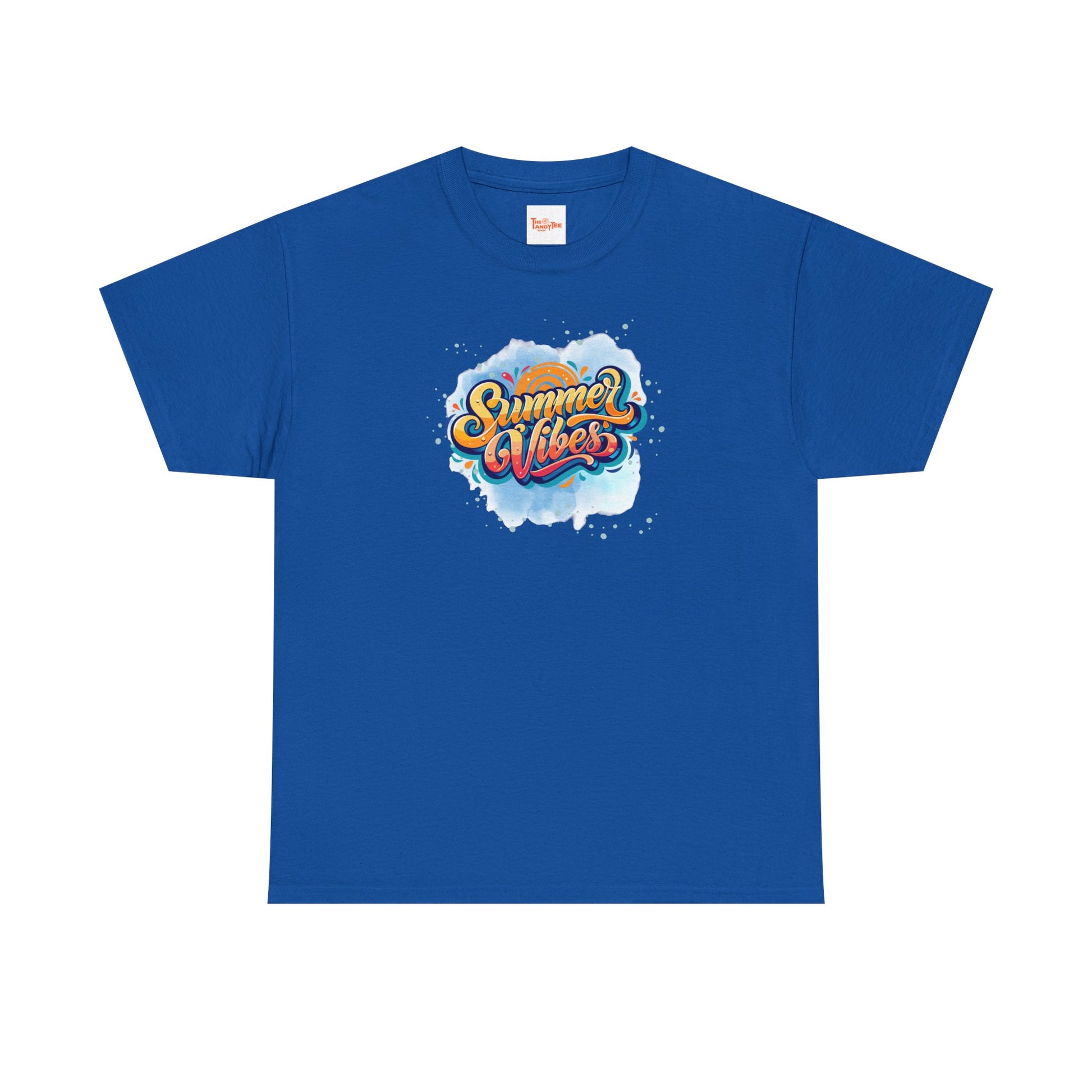 This Tee features a Summer Vibes design with a graphic of a paint splash and sparkles, giving off a fun and lively vibe perfect for casual wear during summer outings or beach trips. It is ideal for adults looking for a comfortable and stylish top to wear during warm weather.