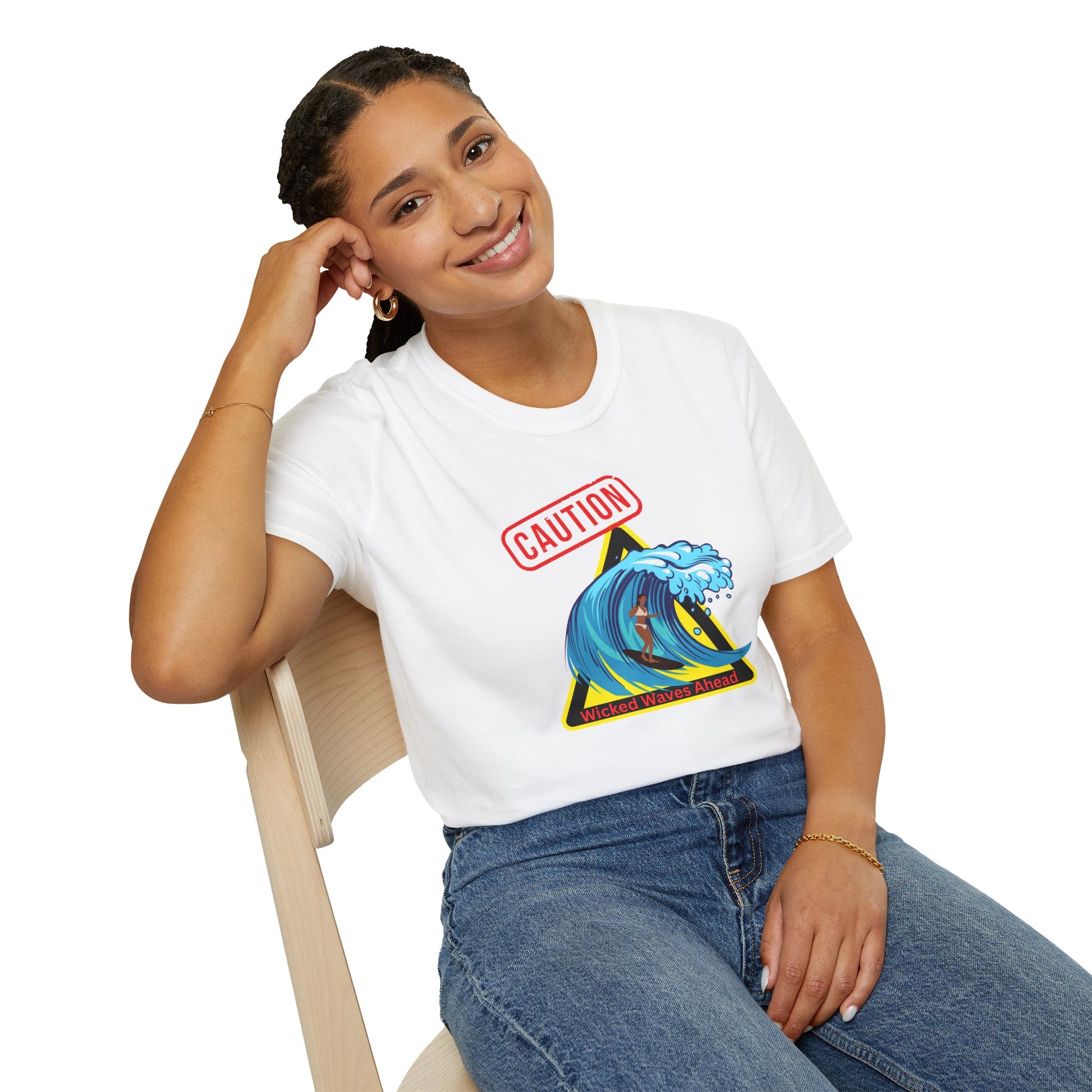 Surfer Caution Unisex T-Shirt - Wicked Waves Ahead Graphic