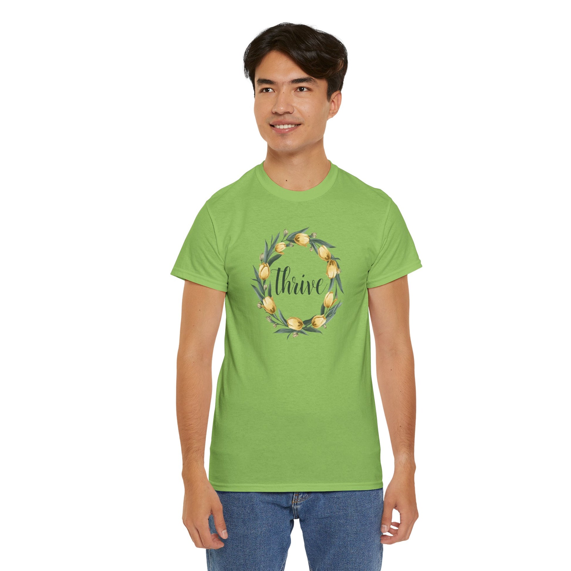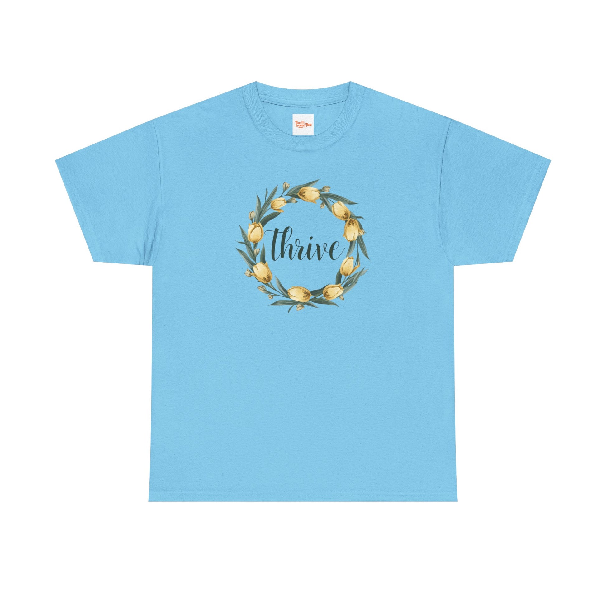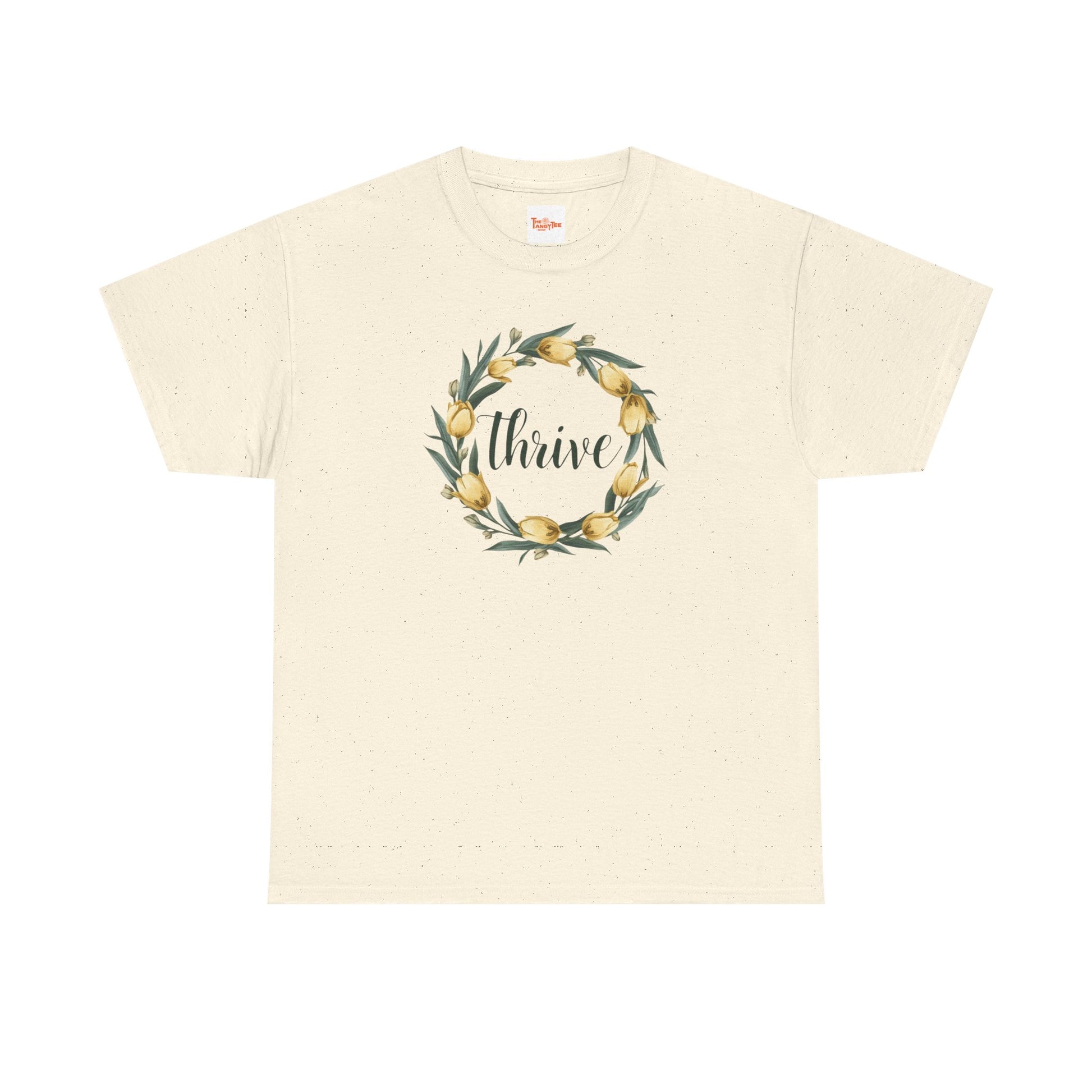 Soft, sunny, and quietly confident — this tee wears like a small celebration. A circular frame of yellow tulips wraps the word “Thrive,” a simple reminder to keep growing, even on ordinary days. The natural cotton body and classic crew neck sit comfortably at the center of easy outfits: layered under a denim jacket for brisk mornings, or alone in warm light with jeans and a favorite pair of sneakers. The floral ring feels both gentle and determined — for people who care about craft, small rituals, and bringing a bit of garden warmth into everyday life. It ages well, holds its shape, and keeps that printed detail crisp wash after wash, so the message and the bloom stay with you.