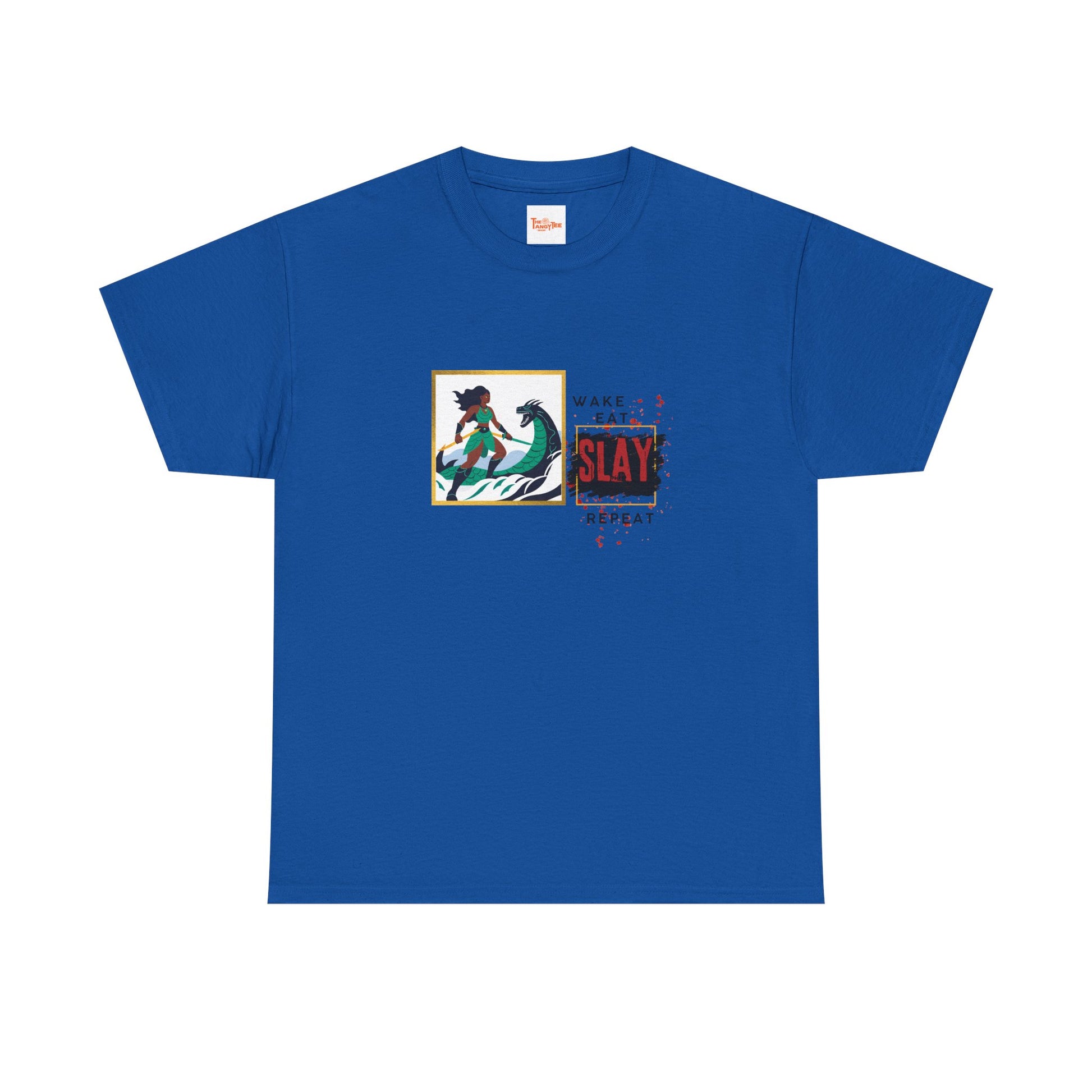 This graphic Tee features a design of a black woman fighting a sea monster with the phrase 'Wake, Eat, Slay, Repeat'. It gives off a bold and empowering vibe, perfect for those looking to make a statement with their outfit. This Tee is relevant for those who love unique and eye-catching designs, and is great for daily wear, casual outings, or as a statement piece for celebrations like Black History Month.