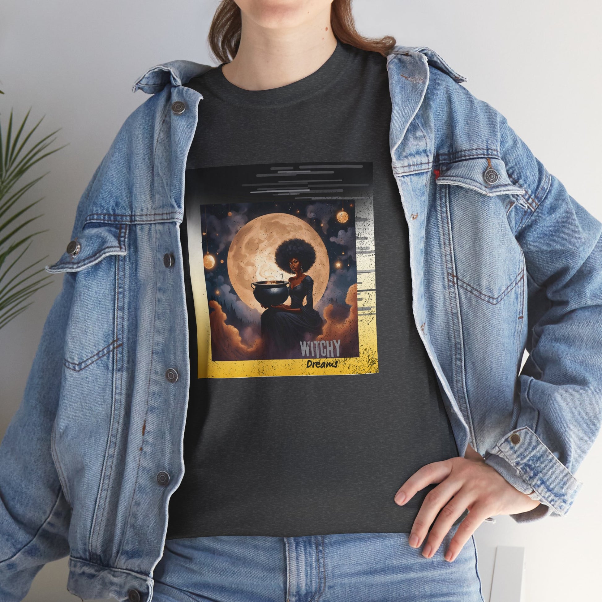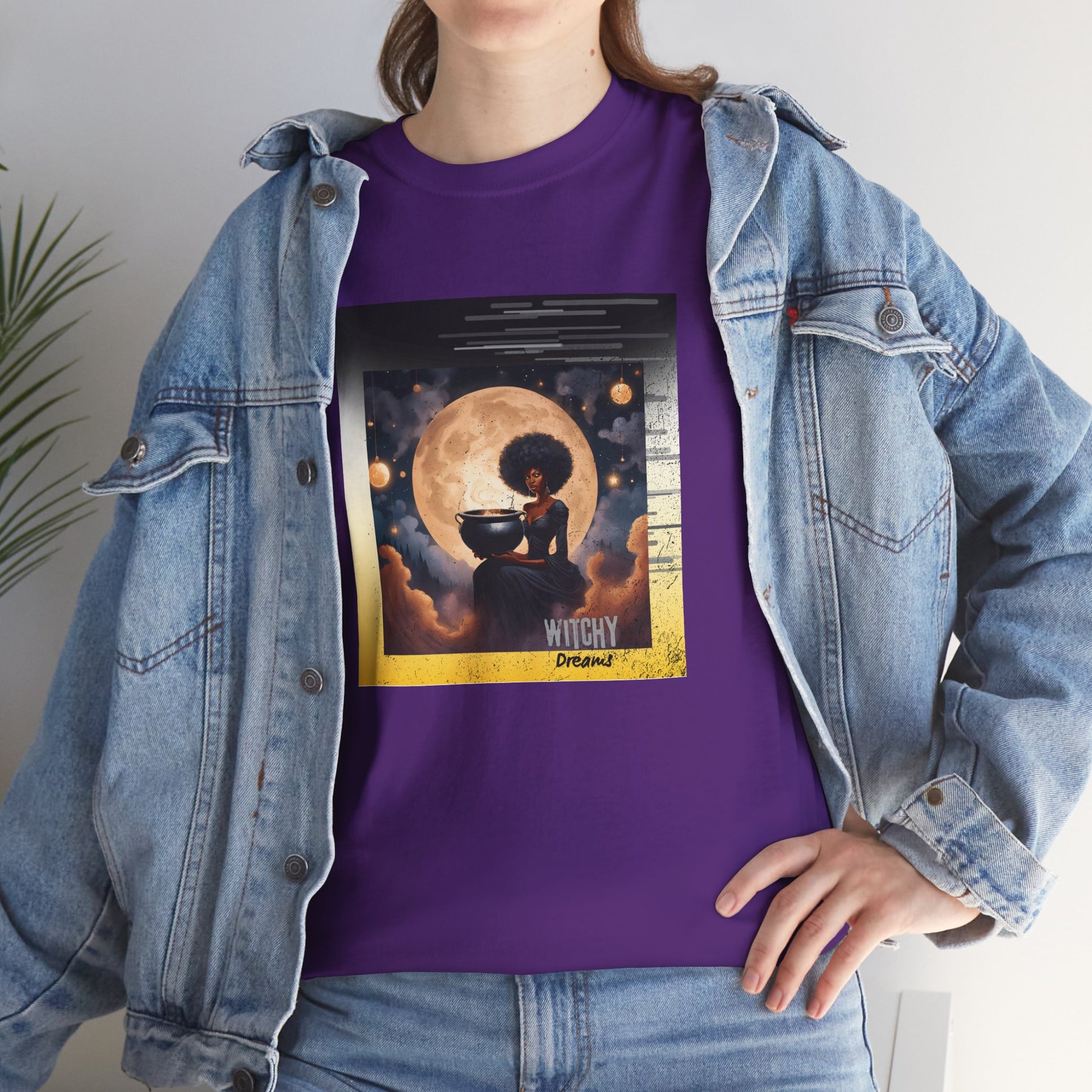 Witchy Dreams T-Shirt featuring a graphic of a black witch with a cauldron, giving off a mystical and magical vibe. Perfect for those who love all things witchy and occult. Ideal for Halloween, magical-themed parties, or everyday wear for witchy enthusiasts.