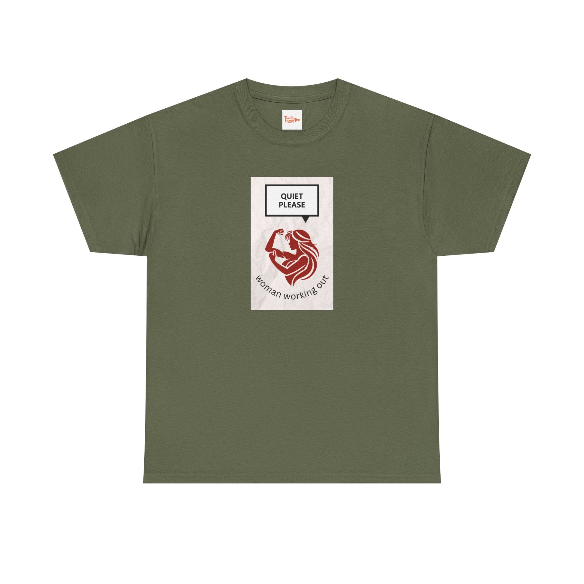 A classic Unisex Heavy Cotton T-Shirt featuring a graphic of a woman flexing her arm with the text 'Quiet Please, Woman Working Out'. This tee exudes a strong and empowering vibe, perfect for fitness enthusiasts and anyone who loves a bold graphic tee. Ideal for casual wear and gym sessions, this tee is a must-have for women who are proud of their strength and determination. Great for birthdays, gym anniversaries, or any celebration of empowerment.